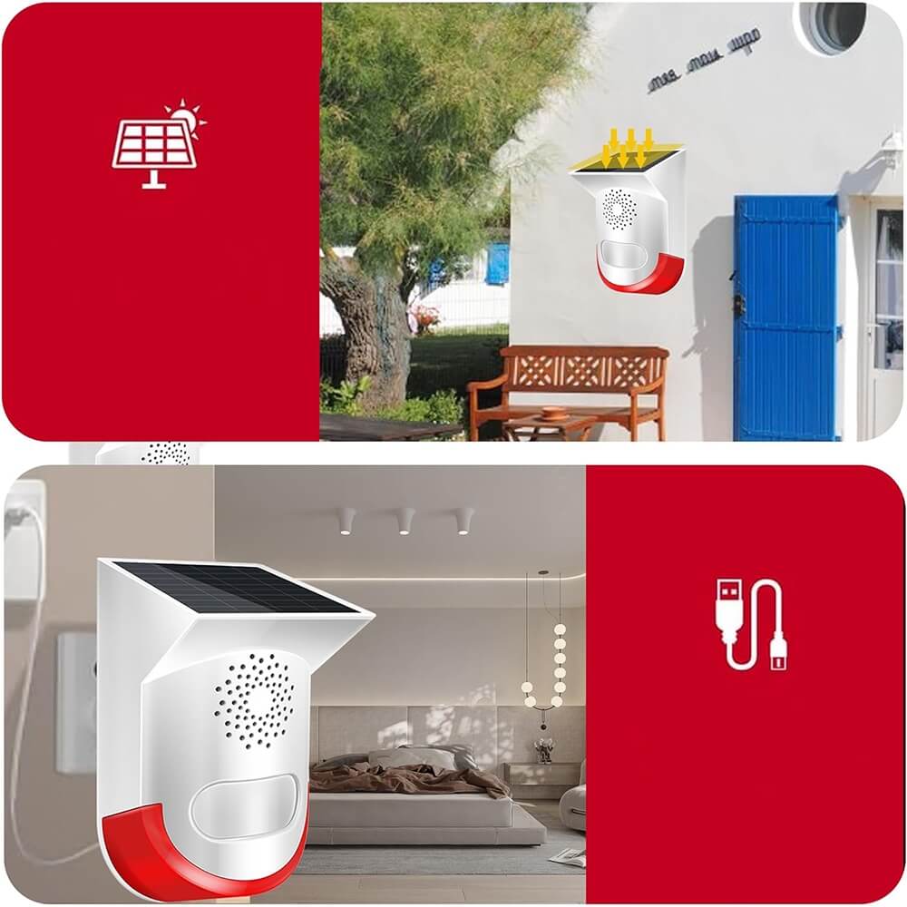 Šis įrenginys sujungia galingą 110 dB sireną, šviesos LED įspėjimą, judesio daviklį ir dvigubą maitinimo būdą (saulės baterija + USB). Komplekte – ir patogus nuotolinio valdymo pultelis, leidžiantis lengvai įjungti, išjungti ar aktyvuoti SOS režimą.
