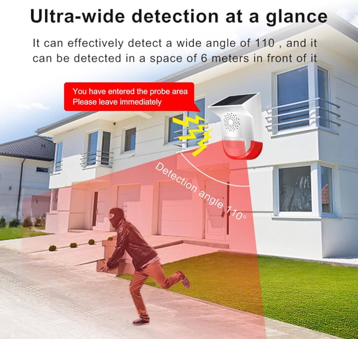 - 110 dB garsinė sirena – pakankamai galinga, kad atbaidytų tiek įsibrovėlius, tiek laukinius gyvūnus.