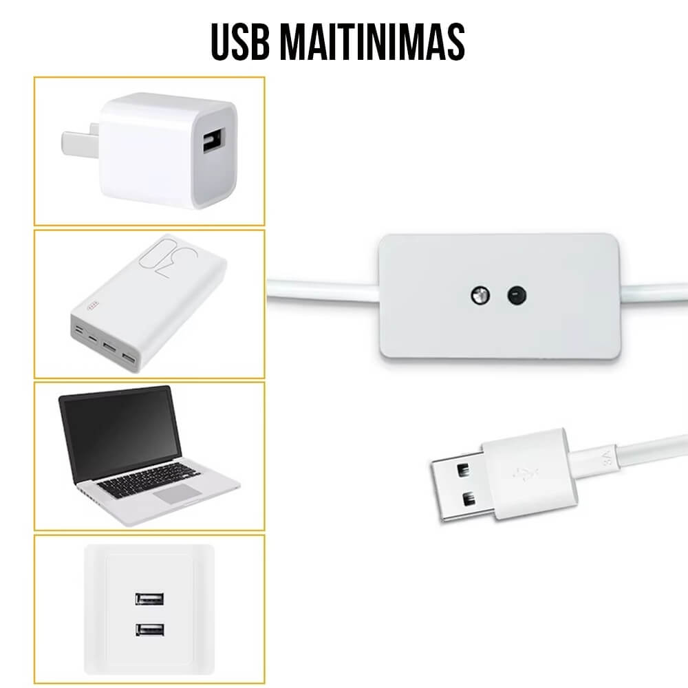 USB maitinimas – galima jungti prie kompiuterio, telefono kroviklio ar power banko