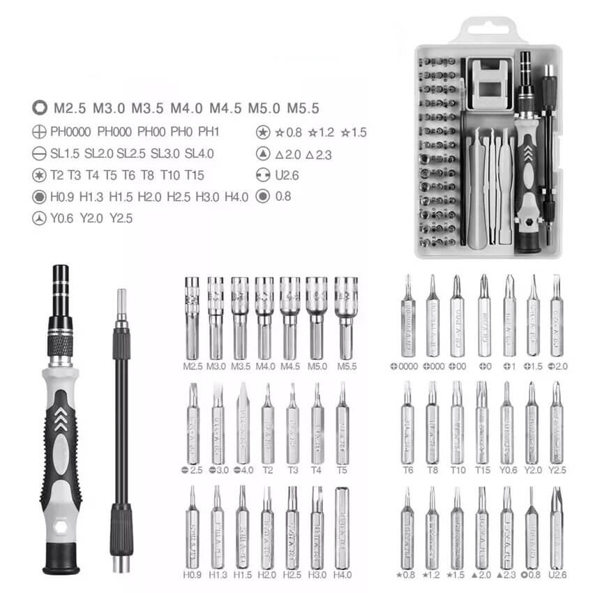 - Funkcionalus atsuktuvų rinkinys, kuriame yra net 52 elementų.