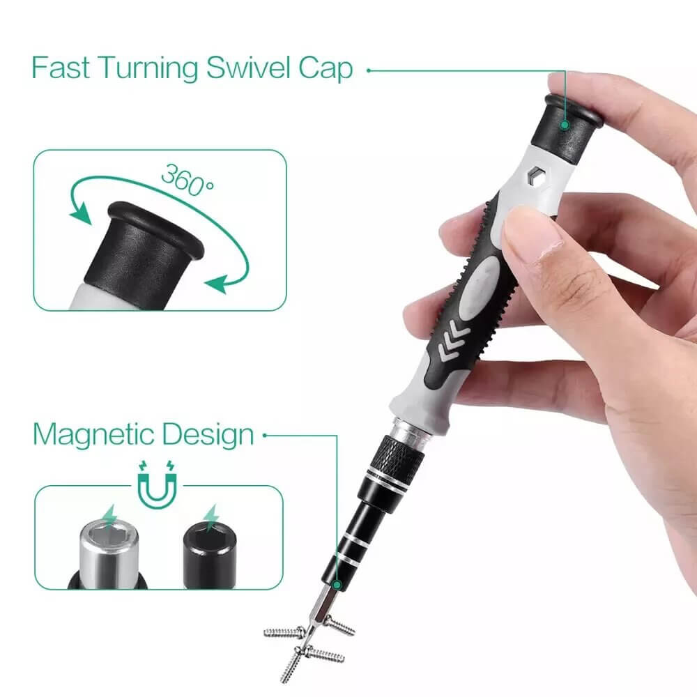 Funkcionalus tikslių atsuktuvų rinkinys, kuriame yra net 52 elementų. Komplekte yra ergonomiškas atsuktuvas, net 42 keičiamų veržlių (antgalių), ilgintuvas, magnetizatorius ir nemažai kitų adapterių ir atidarytuvų, kurie sėkmingai palengvins kiekvieno pasidaryk pats entuziasto darbą. Rinkinys įdėtas į funkcionalų, kompaktišką dėklą. Puikiai tinka tiek mėgėjiškam, tiek profesionaliam naudojimui.