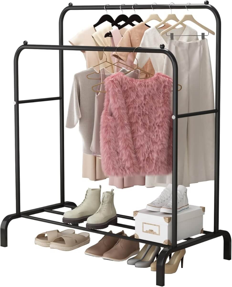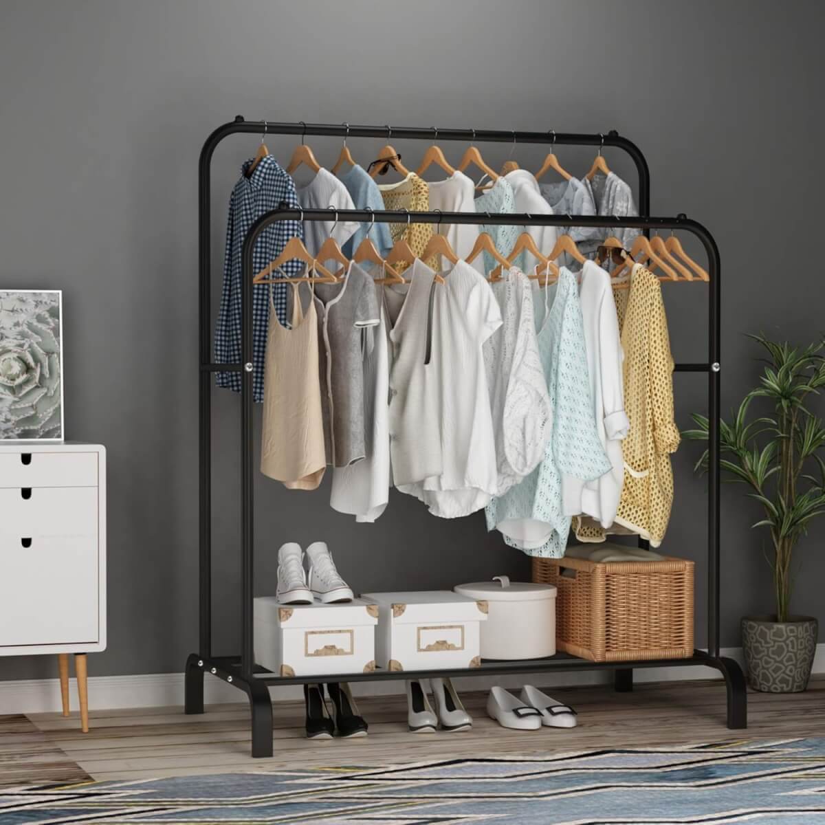 Tvirta metalinė konstrukcija užtikrina stabilumą ir ilgaamžiškumą, o du pakabinimo strypai leidžia patogiai rūšiuoti drabužius pagal ilgį ar sezoniškumą. Apatinė lentyna puikiai tinka batams, dėžutėms ar krepšiams laikyti. Modernus juodos spalvos dizainas dera prie įvairių interjero stilių.