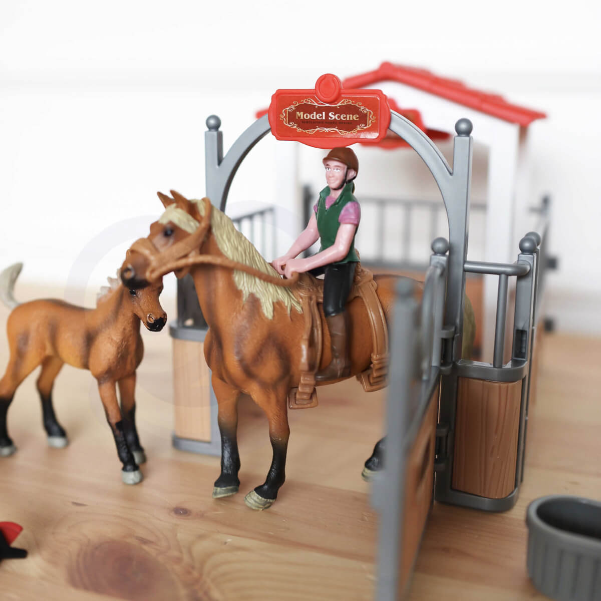 WOOPIE Stable arklidės žaidimų rinkinys – 18 dalių žirgynas su 2 žirgais ir žokėju, nuo 3 metų