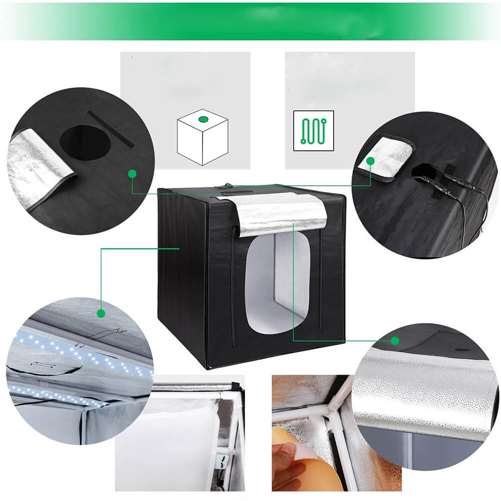 Ši foto studija skirta įamžinti kokybiškai Jūsų produktus, namų sąlygomis. Nesvarbu ar fotografuosite su telefonu ar su fotoaparatų, nuotraukos bus daug kokybiškesnės, kadangi dėžutė yra pritaikyta fotografuoti daiktams ir joje yra reguliuojamas LED apšvietimas.