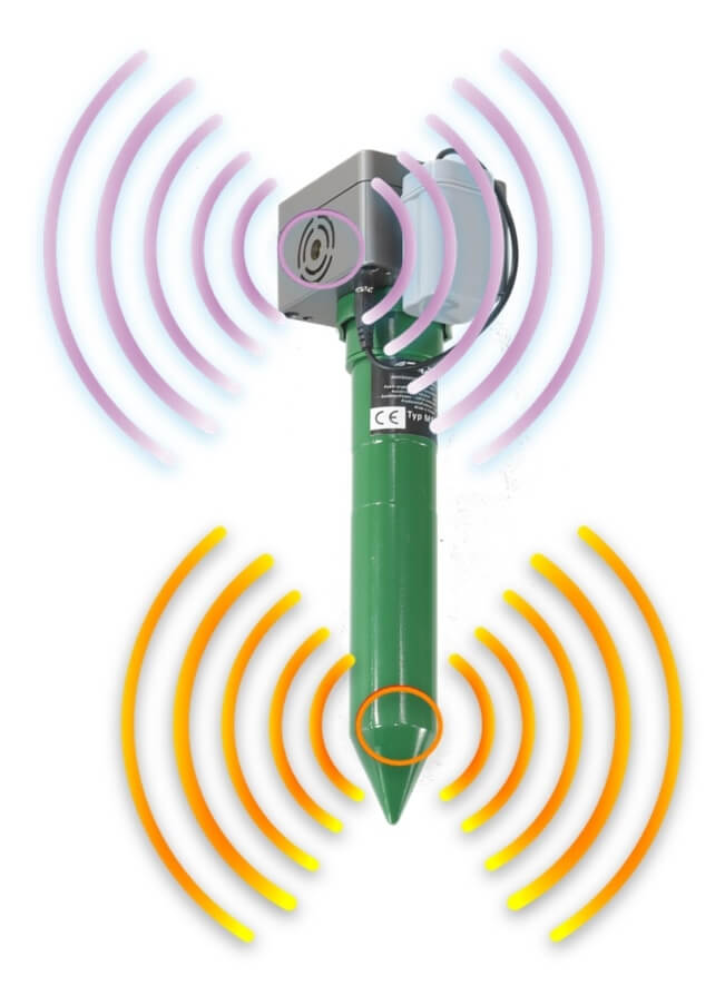 Be to, repelentas turi antrą stiprių impulsų generatorių, esantį jo viršuje – šis skleidėjas skleidžia garsus virš žemės aplinkui. Šis generatorius turi nepriklausomą valdiklį ir nepriklausomą maitinimo šaltinį. Jį galima išjungti.