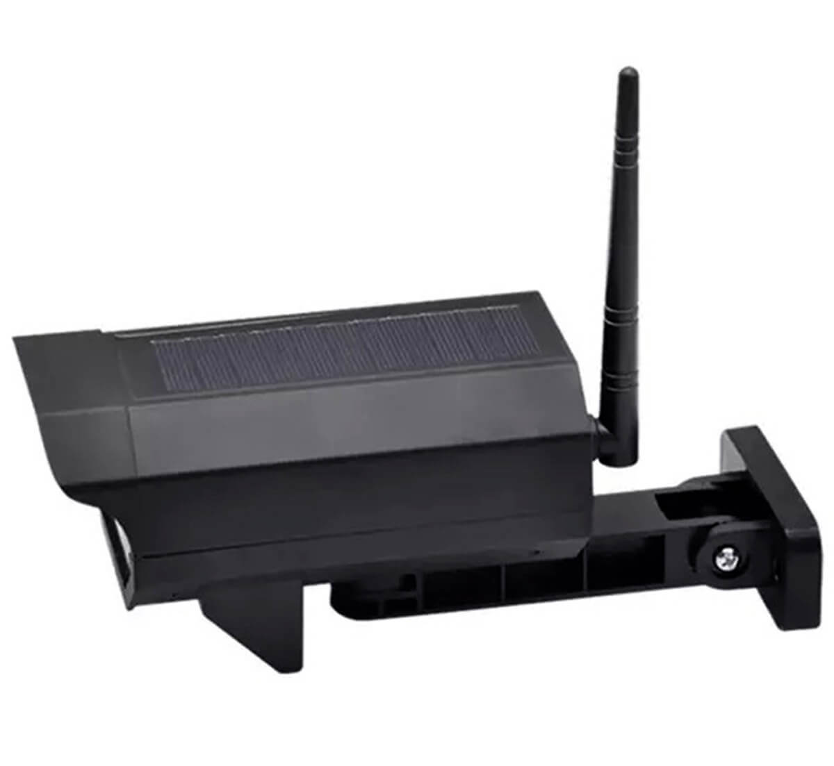 Pakabinama LED saulės lempa su kameros imitacija ir IR nuotolinio valdymo pulteliu. Reguliuojamas laikiklis apačioje leidžia lengvai pritvirtinti šviestuvą ant tvoros, stogo ar pastato fasado. Gaminys puikiai imituoja stebėjimo kameros formą, kuri pasižymi efektyviu atgrasomuoju poveikiu, kurį dar labiau sustiprina įmontuotas judesio jutiklis. Įrengti ryškūs ir energiją taupantys 42 SMD šviesos diodai, maitinami iš vidinės baterijos, įkraunamos iš saulės baterijos. Nereikia papildomų maitinimo šaltinių. IR nuotolinio valdymo pultas leidžia patogiai valdyti lempą.