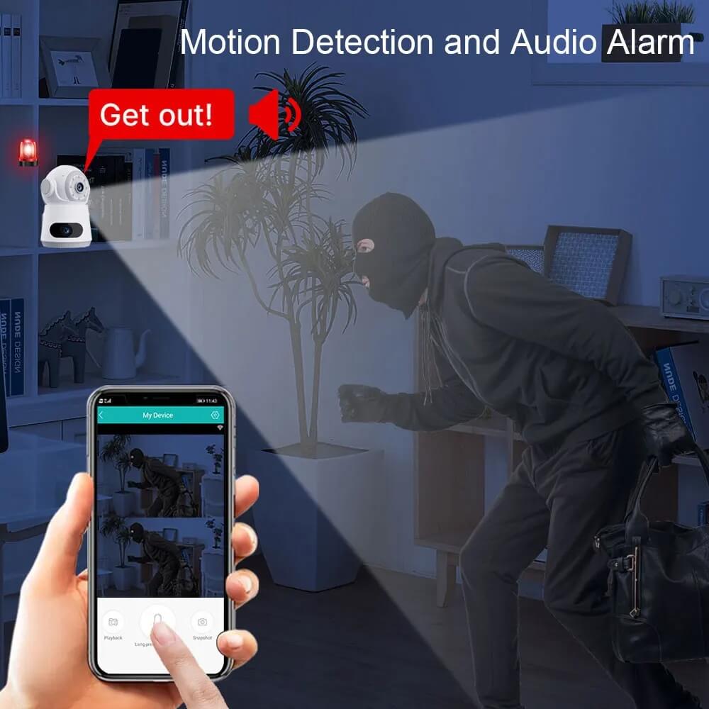 - Judėjimo detektorius ir garsinis aliarmas: Aptikus judesį, kamera iškart siunčia įspėjimą į telefoną ir, jei reikia, įjungia garsinį įspėjimą (pvz., „Get out!“), kuris gali išgąsdinti įsibrovėlį.