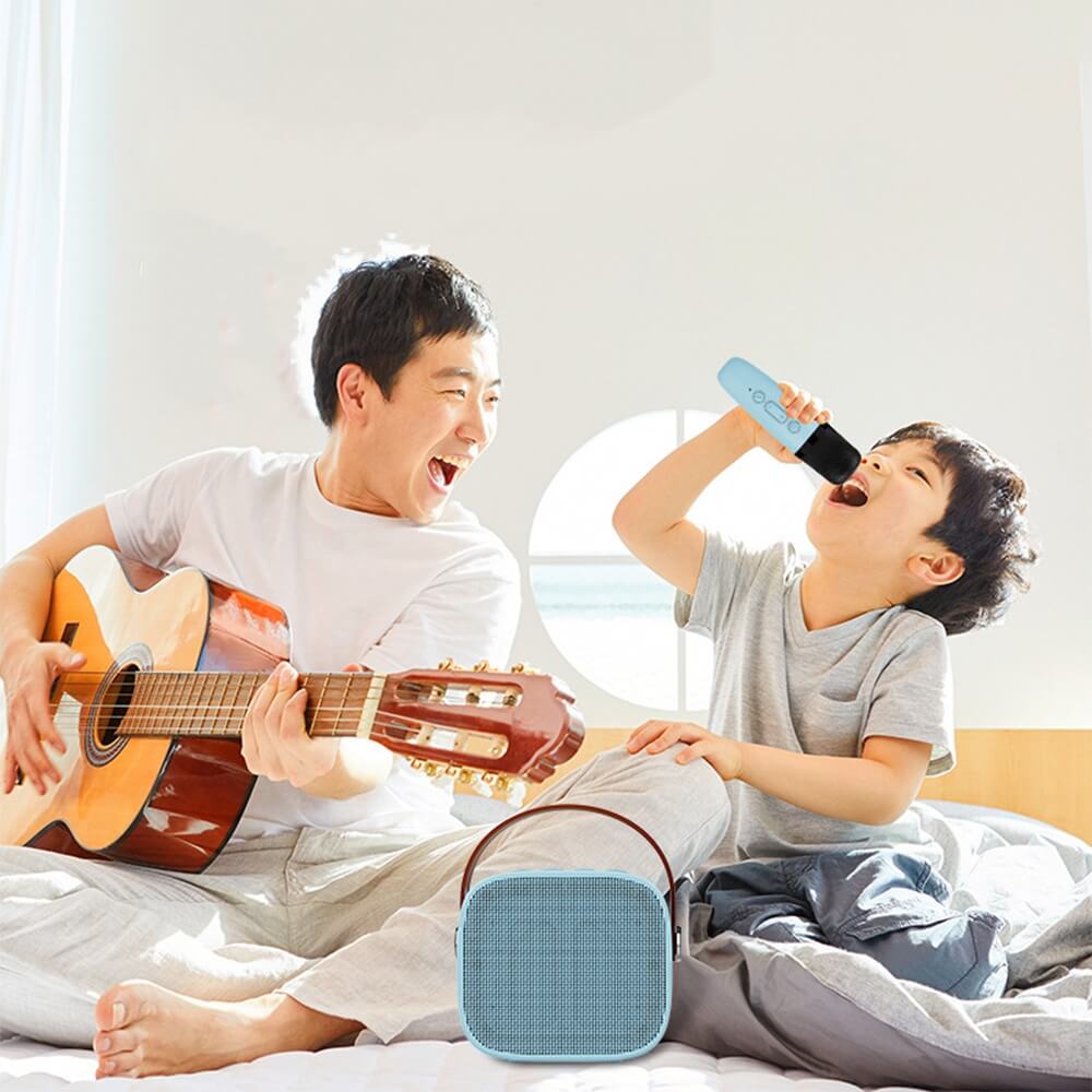 Belaidė garso kolonė su bluetooth ir USB. Mikrofonas skirtas dainuoti karaoke pagal pasirinktas dainas. Dainas galima leisti iš išmanaus telefono bluetooth ryšiu arba iš USB laikmenos. Mikrofonas taip pat leidžia reguliuoti muzikos, dainavimo garsą, aidą, bosus. Mikrofono galvutė turi tris triukšmo mažinimo procesus, efektyviau paryškinkite savo gražų balsą. Visos idealios dainos, balso programos gali būti naudojamos, kaip „Bluetooth” garsiakalbiai.