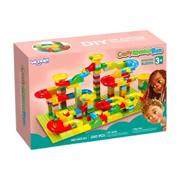 - Net 340 elementų: kaladėlės, posūkiai, čiuožyklos ir kamuoliukai