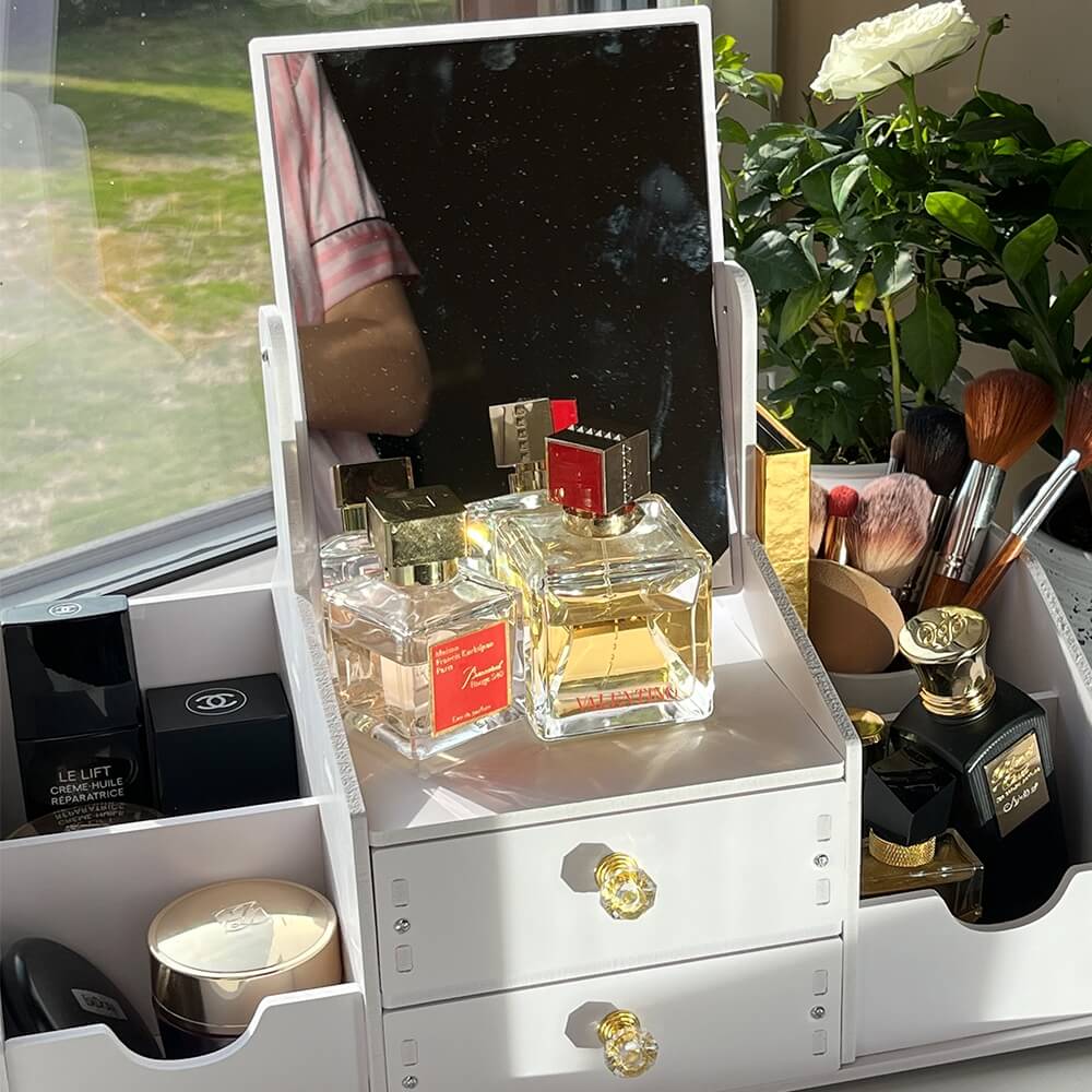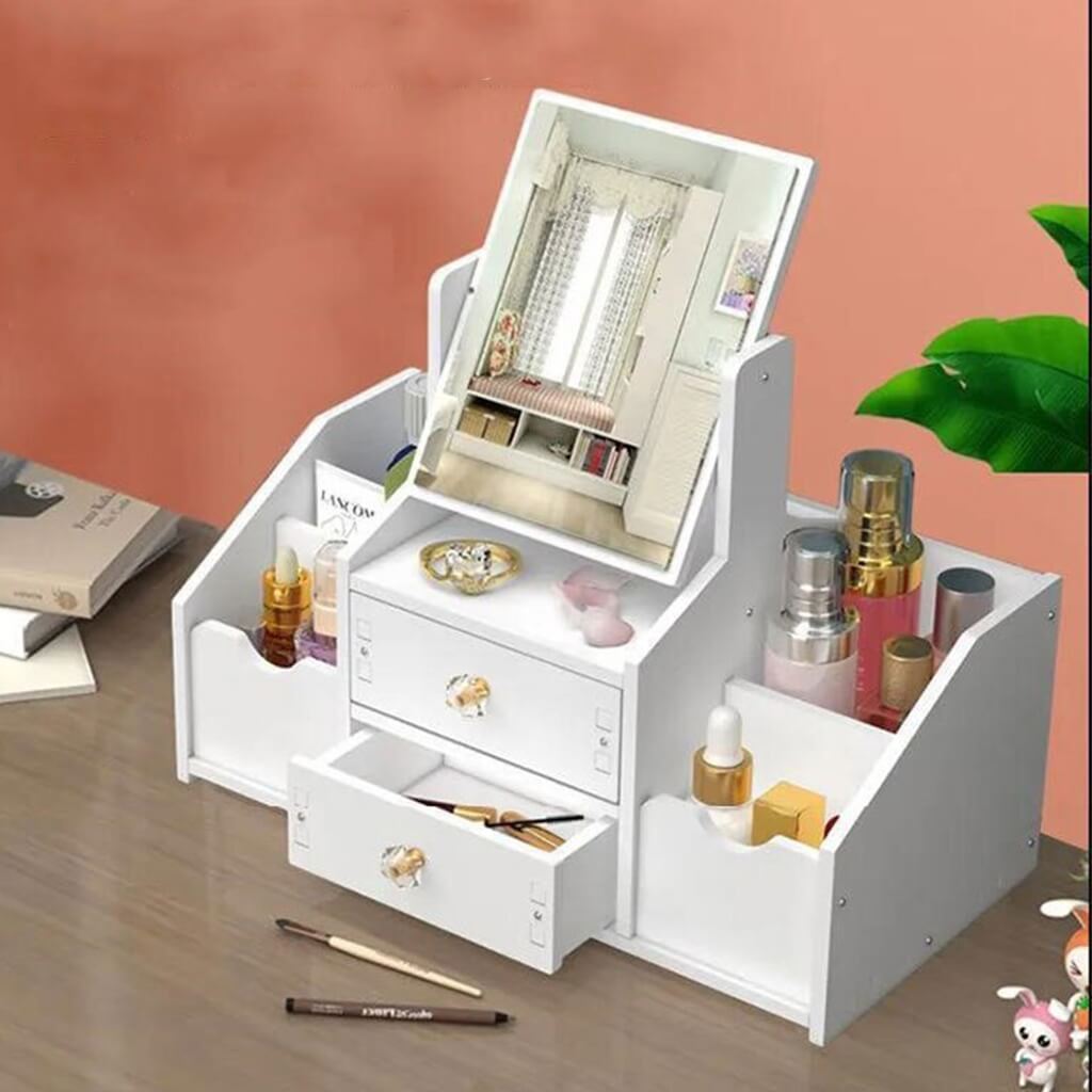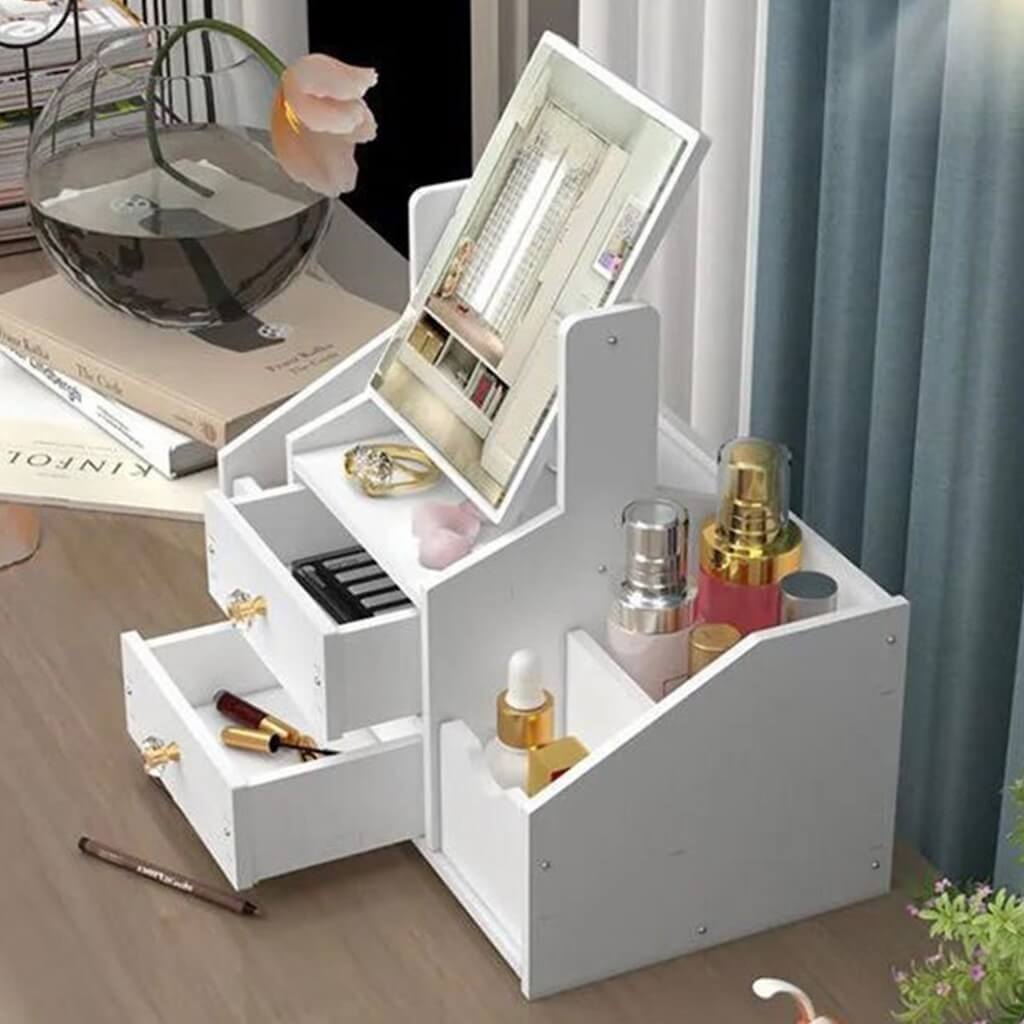 Dėžutės centre pritvirtintas kvadrato formos veidrodis. Jį galima reguliuoti įvairiais kampais. Staliuke yra du stalčiai įvairiems reikmenims laikyti. Stalčiukus lengva išimti valymui. Ši kosmetinis staliukas pagamintas iš aukštos kokybės MDF plokščių. Švelni balta apdaila spindi ir atrodo ypač prabangiai. Jį galima derinti su kitais baldais arba naudoti kaip kosmetinį staliuką.