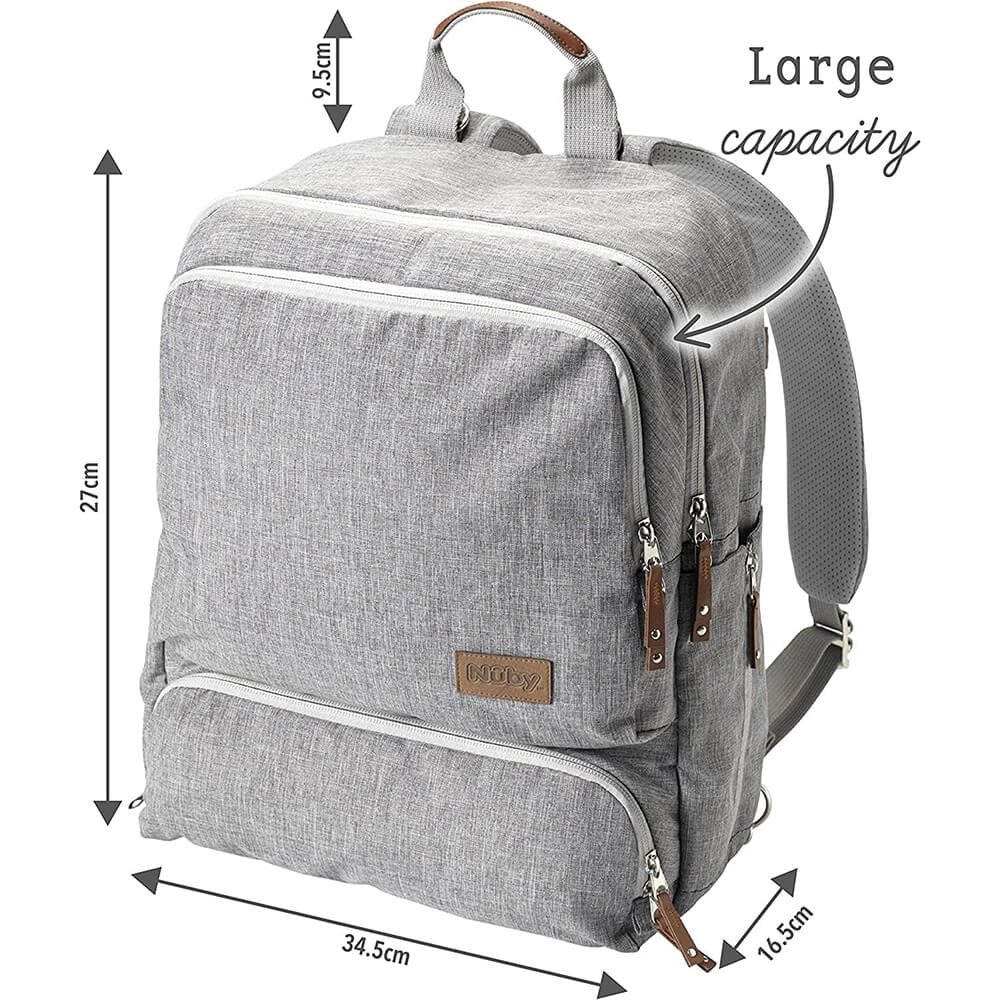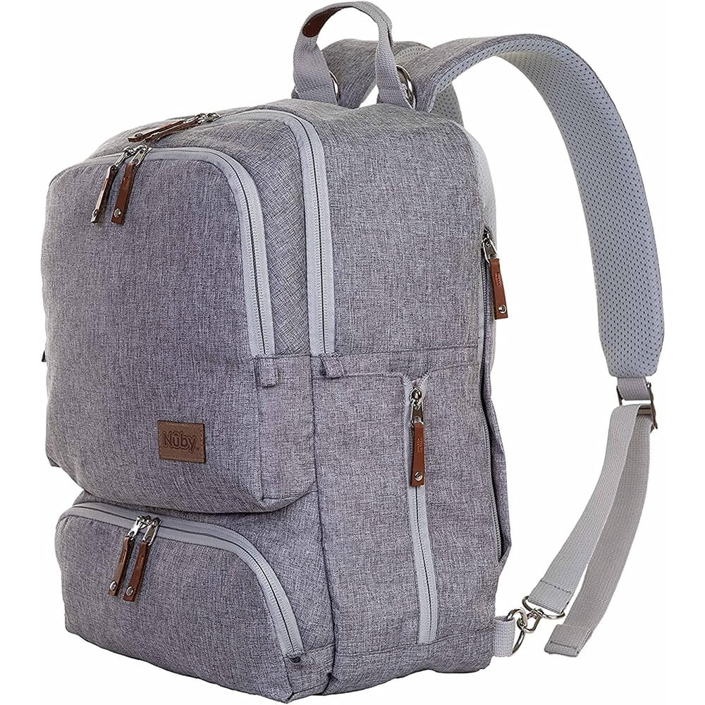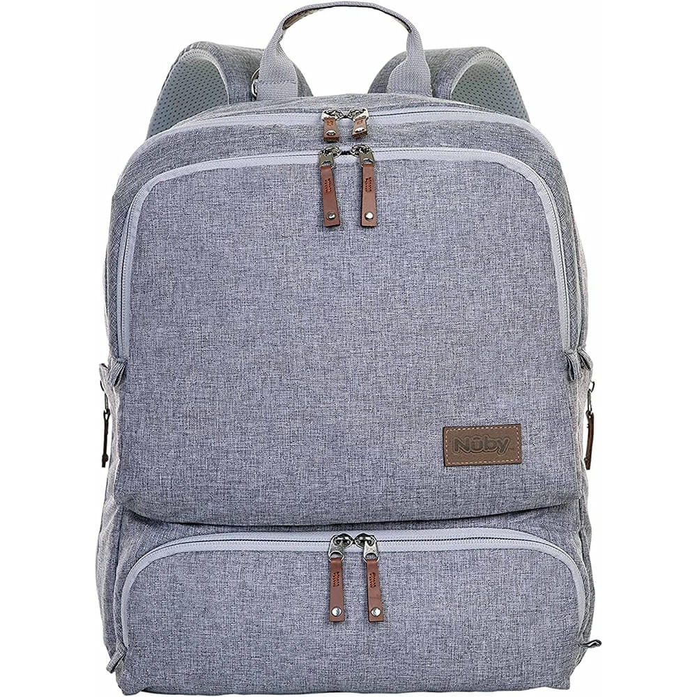 - Stilingas ir praktiškas: pilkas kuprinės stiliaus sauskelnių krepšys su keliomis kišenėmis