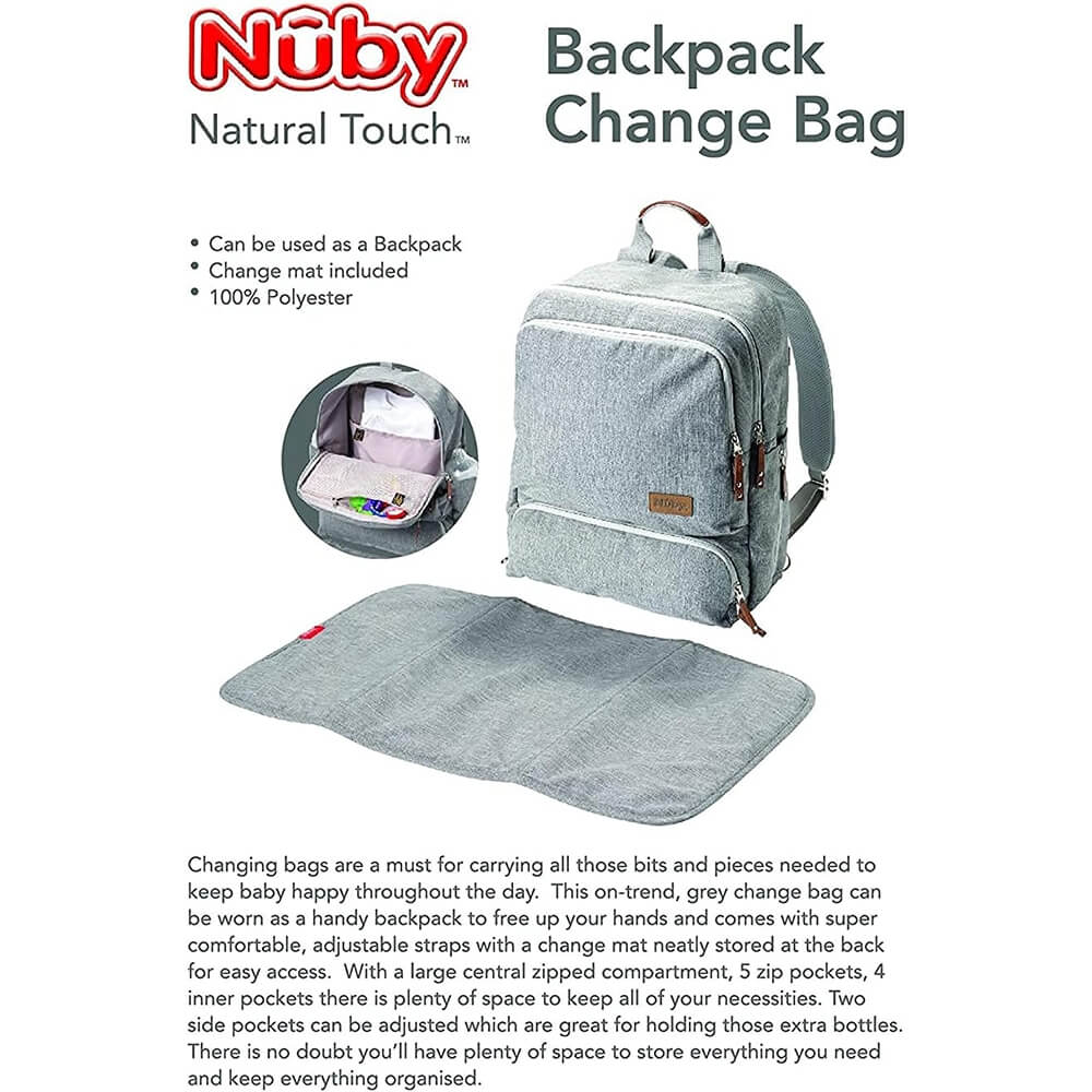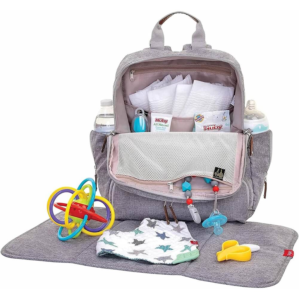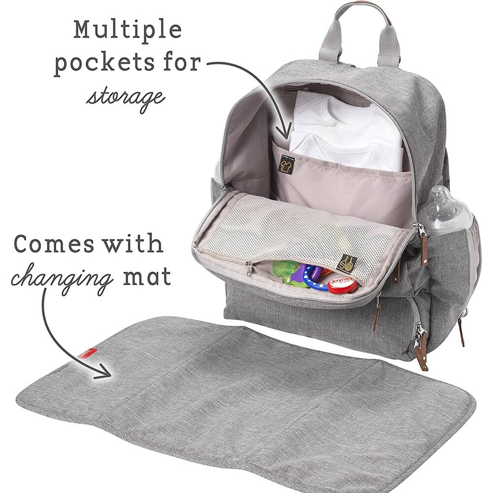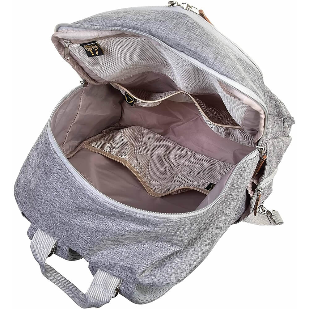 - Stilingas ir praktiškas: pilkas kuprinės stiliaus sauskelnių krepšys su keliomis kišenėmis