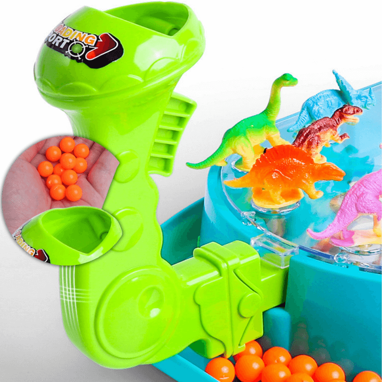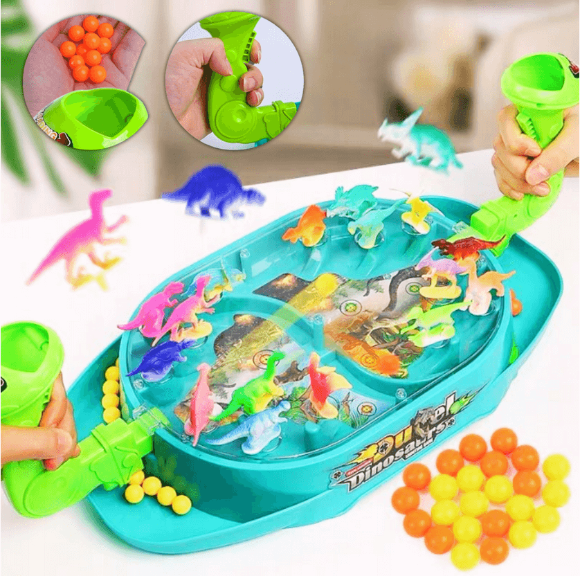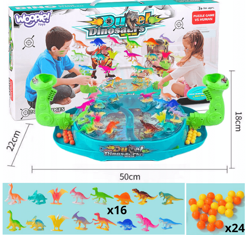 Leiskitės į dinozaurų dvikovą! Dinosaur Battle – tai Woopie prekės ženklo arkadinis stalo žaidimas, kuris lavina akių-rankų koordinaciją, koncentraciją ir reakcijos greitį. Dėliokite dinozaurus ant lentos, užpildykite laikiklį kamuoliukais ir šaudykite – laimi tas, kuris greičiau numuša priešininko dinozaurus.