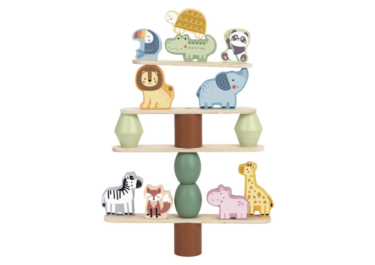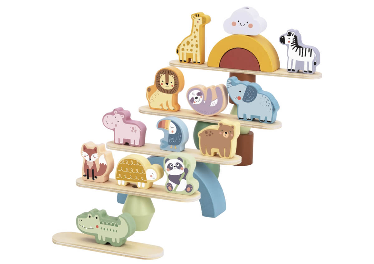 - 29 dalių rinkinys: 12 mielų medinių gyvūnėlių, 16 balansuojančių priedų (vaivorykštė, akmenys, platformos, debesis) ir bukletas su statinių pavyzdžiais.