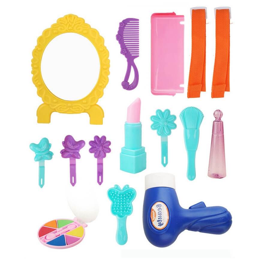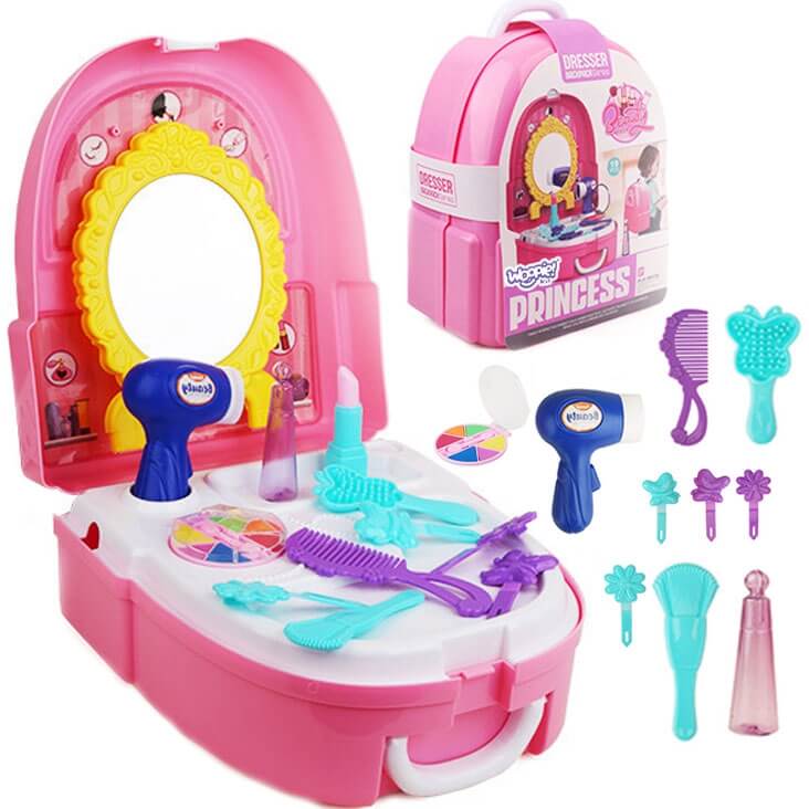 - Paskirtis: vaidmenų žaidimams, grožio salonui/vaikiškam tualetiniam staliukui namuose ir kelionėje
