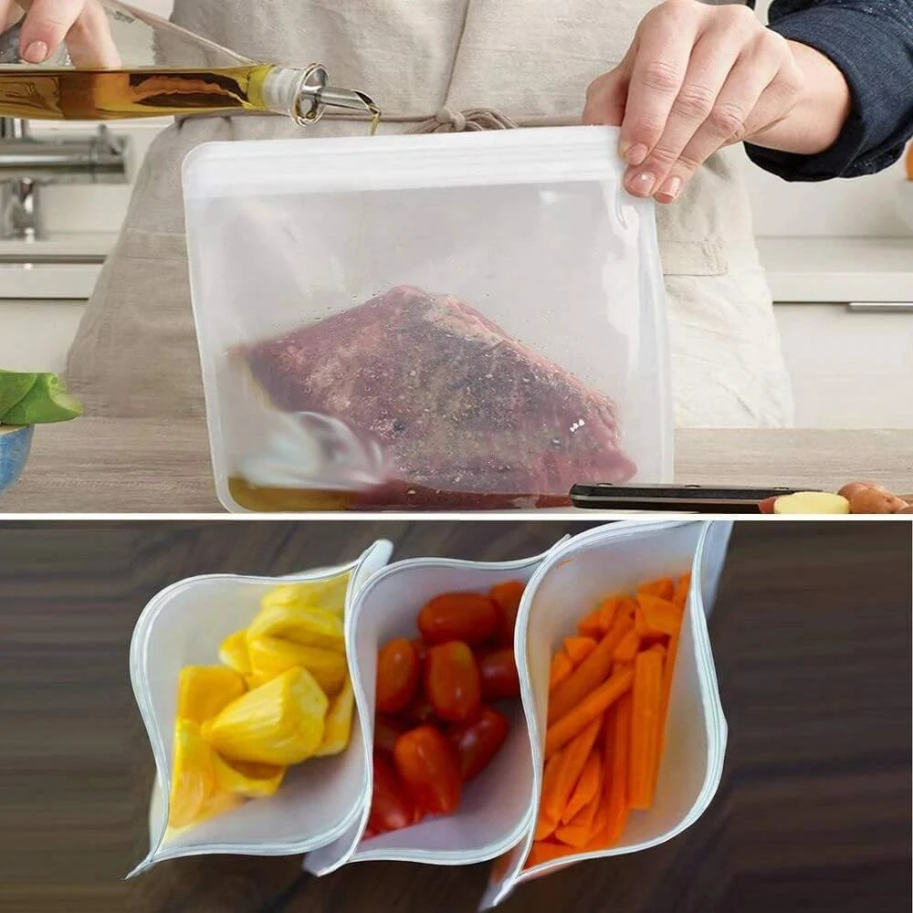 Sandarūs, daugkartiniai silikoniniai maišeliai – patogus sprendimas maisto ir gėrimų laikymui, užšaldymui ar pašildymui. Puikiai tinka marinavimui, daržovėms, vaisiams, padažams, likusiam maistui ir kt. Mažinkite vienkartinio plastiko naudojimą ir rinkitės ilgalaikį sprendimą.