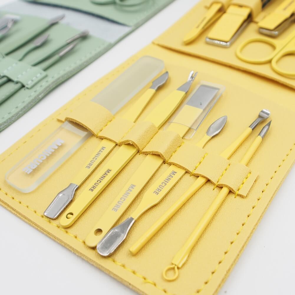Itin praktiškas priemonių rinkinys pedikiūrui, manikiūrui ir kitoms nagų procedūroms. Yra 12 elementų, tokių kaip nagų žirklės, replės, pjaustytuvai. Visi įrankiai pagaminti iš aukštos kokybės nerūdijančio plieno, kuris yra saugus liestis su oda. Manikiūro įrankiai supakuoti į estetišką uždarą dėklą, todėl rinkinį lengva nešiotis.