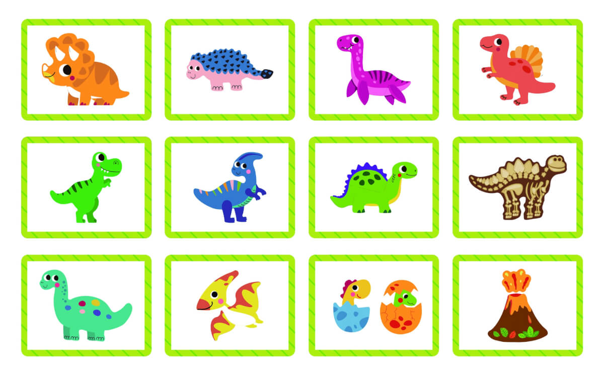 - 12 dinozaurų raštų, 1 ugnikalnio dizainas ir dinozaurų pora kiaušiniuose