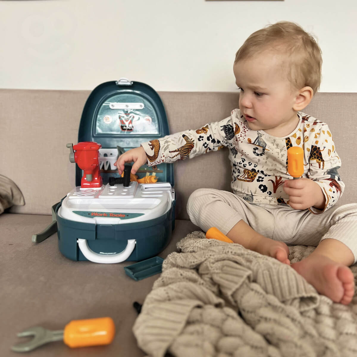 WOOPIE Little Tinker – tai smagus ir praktiškas kuprinės tipo įrankių rinkinys, padedantis vaikams saugiai atrasti meistravimo pasaulį.