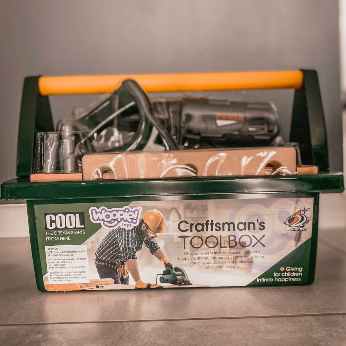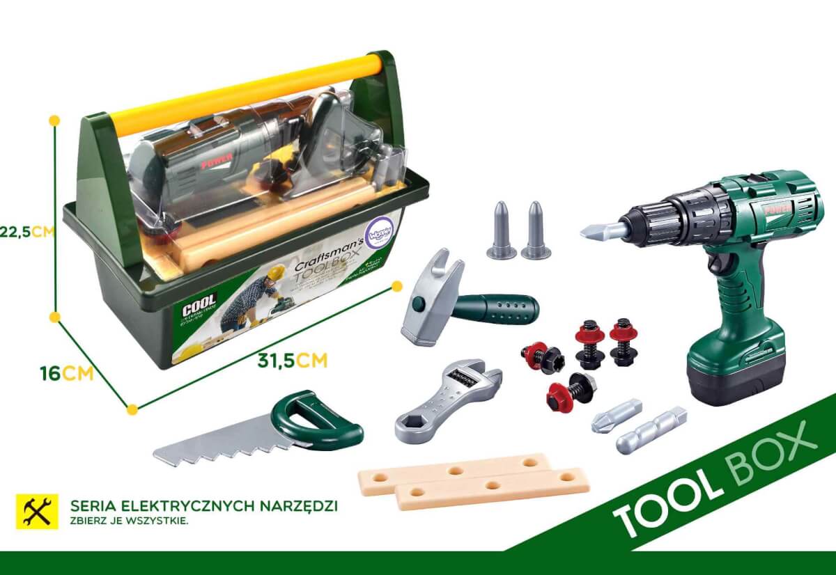 Leiskite mažiesiems meistrams pasijusti tikrais „pasidaryk pats“ herojais! Tamsiai žalia, talpi WOOPIE įrankių dėžė su patogia geltona rankena talpina 15 saugių, vaikams pritaikytų įrankių ir priedų. Realistiškas, belaidis atsuktuvas/gręžtuvas su šviesos ir garso efektais bei 3 keičiami antgaliai leidžia įsitraukti į tikrovišką žaidimą ir lavinti įgūdžius.
