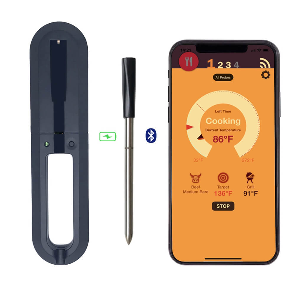Orkaitės, grilio ar aliejaus temperatūrą matykite savo telefone belaidžiu būdu per Bluetooth. Nerūdijančio plieno zondas atsparus ir ilgaamžis. Galima naudoti kepant šašlykus, barbekiu ar kitą mėsą orkaitėje.