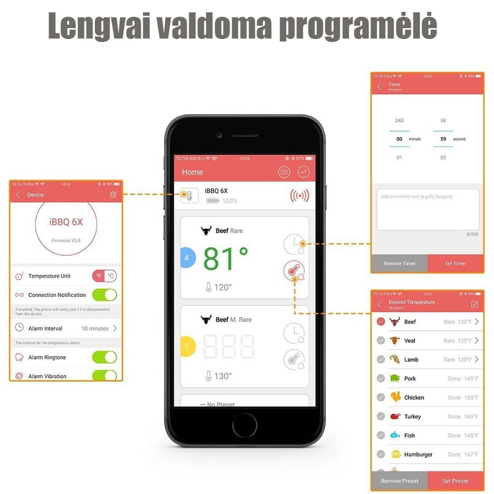 3. Savo telefono programėlėje pasirinkite kepamos mėsos rūšį ir nustatykite kepimo temperatūrą. Vienu metu galima naudoti 2 zondus, kurie telefono programėlėje yra pavaizduoti skirtingomis spalvomis.