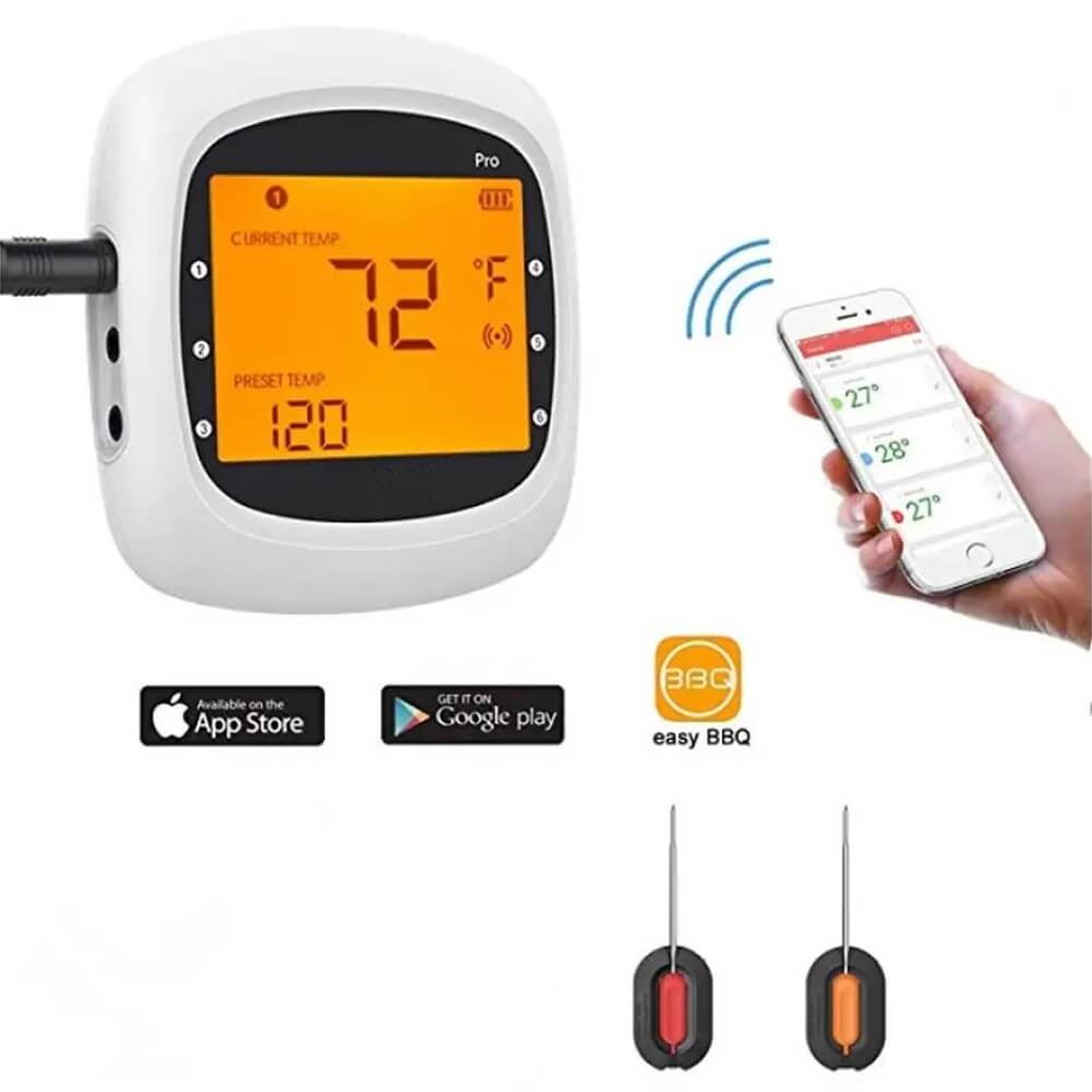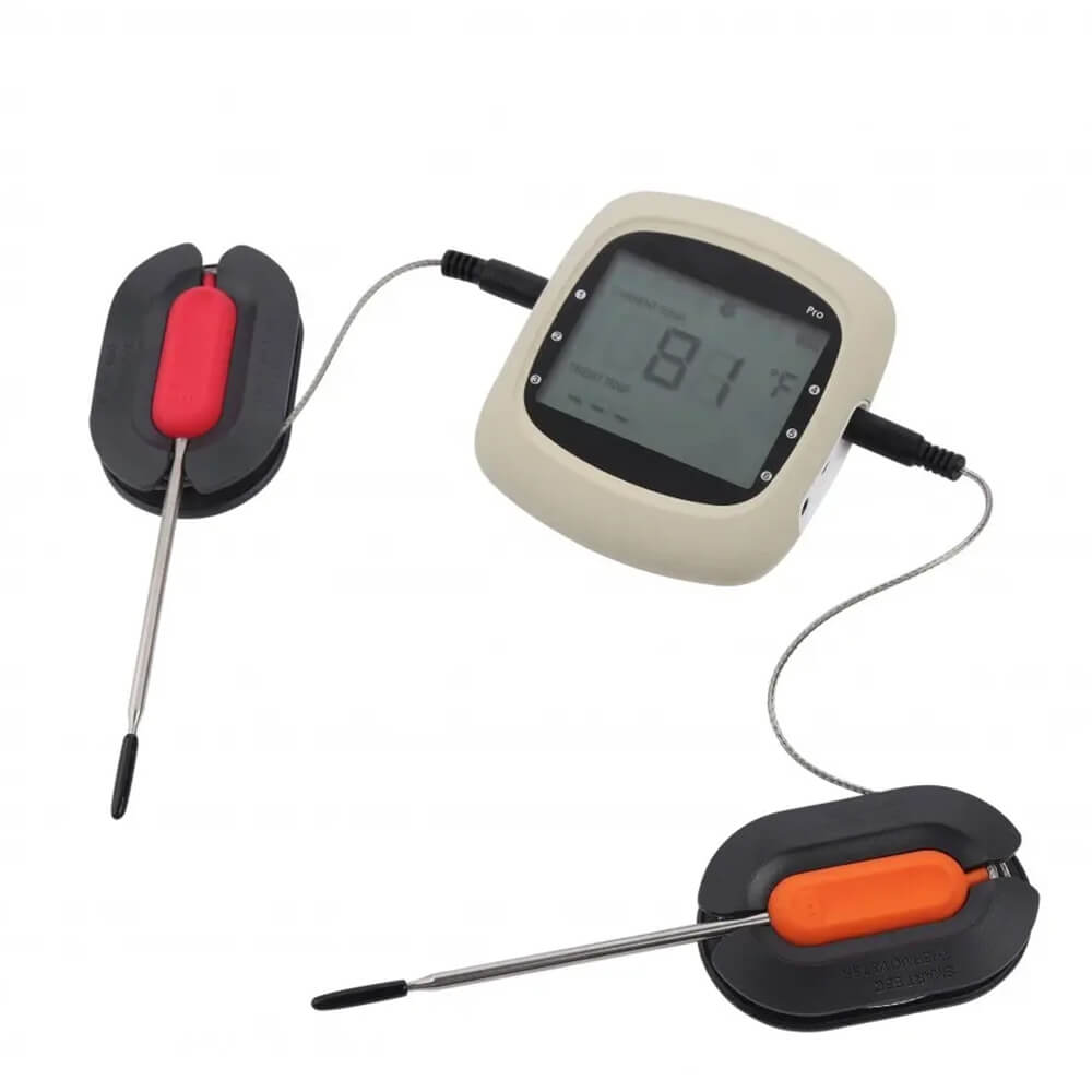 Išmanusis belaidis grilio termometras Jums bus nepamainomas pagalbininkas maisto ruošimo grilyje metu. Šis termometras turi 2 zondus, su kuriais galėsite matuoti 2 skirtingų patiekalų temperatūrą vienu metu, taigi maisto ruošimas bus daug lengvesnis. Kad būtų dar patogiau, šis grilio termometras yra specialiai sukurtas naudojimui su „easyBBQ“ programėle, kurią turėsite įsidiegti savo telefone. Programėlė veikia tiek su „iOS“, tiek su „Android“ operacinėmis sistemomis. Tiesiog pridėkite termometrą prie ruošiamo maisto, pasirinkite ruošiamos mėsos rūšį, kepimo temperatūrą, o įrenginys ir programėle atliks visa kita. Jums nebereikės nuolatos tikrinti ruošiamo maisto ir jaudintis dėl perkepimo, taigi tuo metu galėsite užsiimti kita, sau malonia veikla.