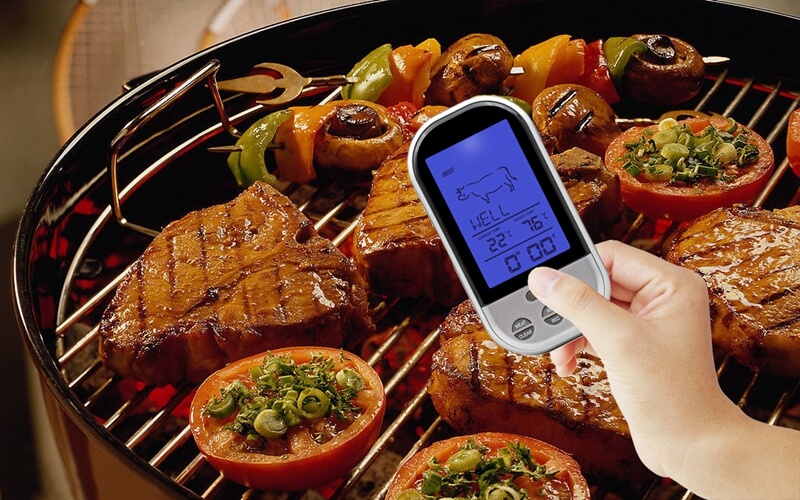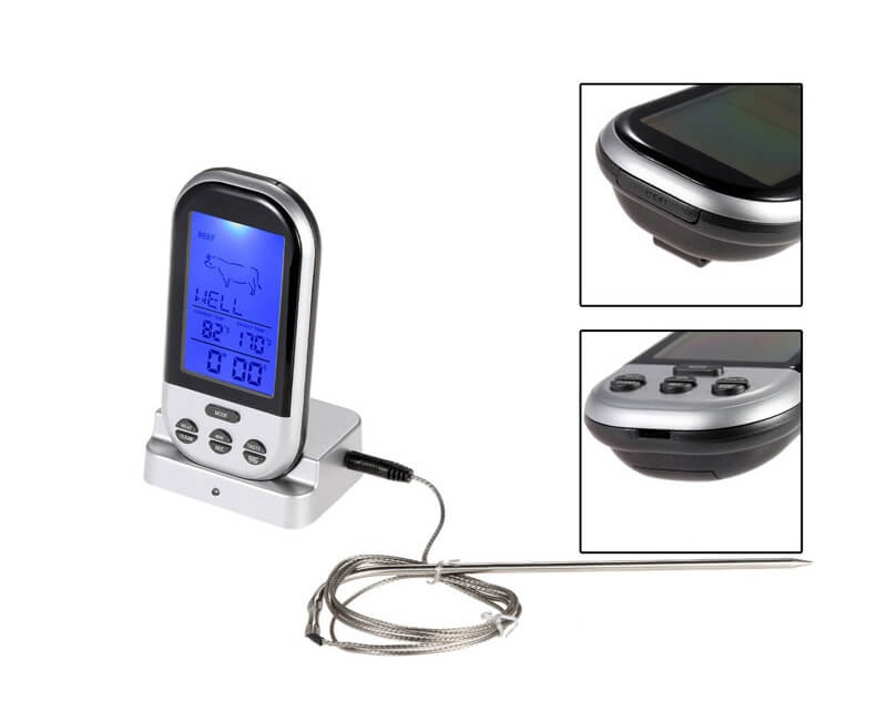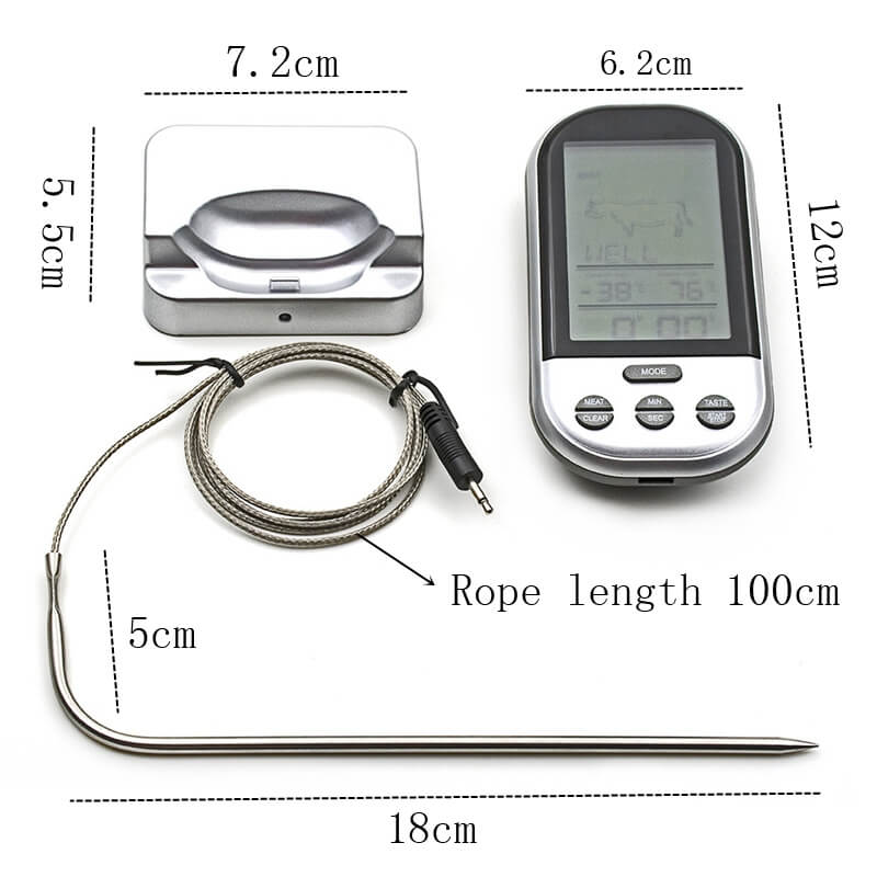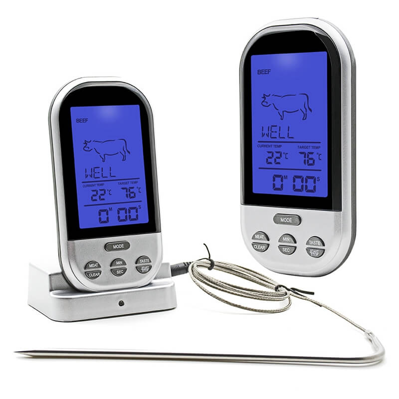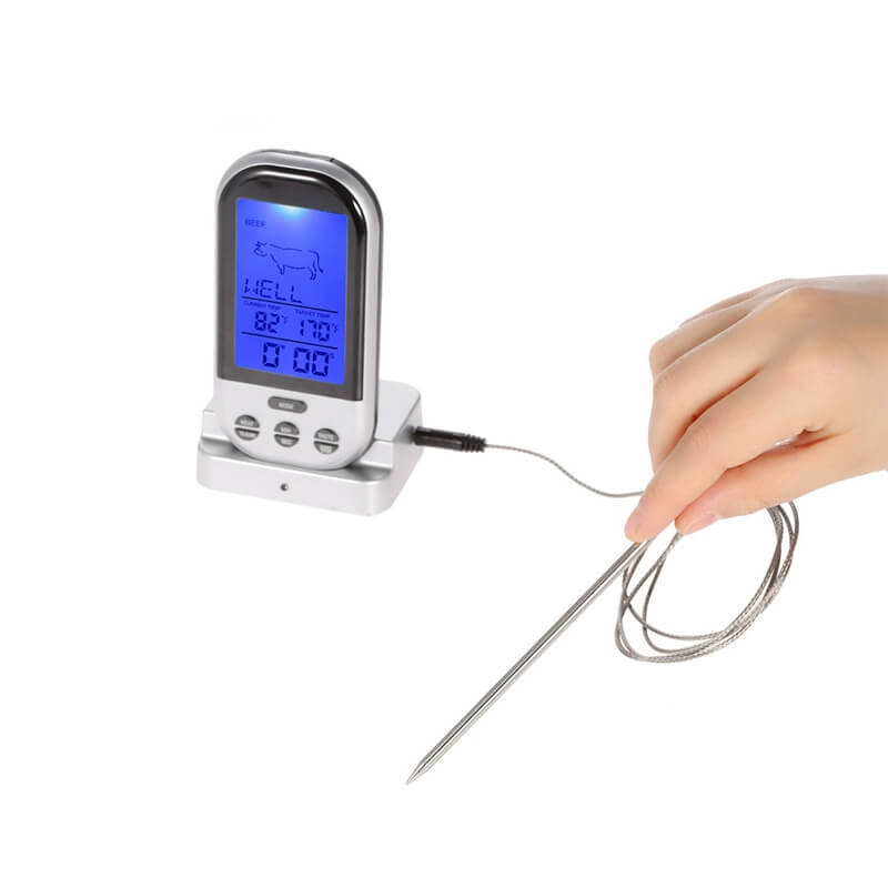 Tikslus elektroninis termometras maisto ruošimui, skirtas patogiai stebėti mėsos ir kitų patiekalų temperatūrą. Belaidis ryšys leidžia stebėti rodmenis per atstumą, o įspėjamasis signalas praneša, kai pasiekiama nustatyta temperatūra arba baigiasi laikas. Nerūdijančio plieno zondas užtikrina patvarumą ir saugų kontaktą su maistu.