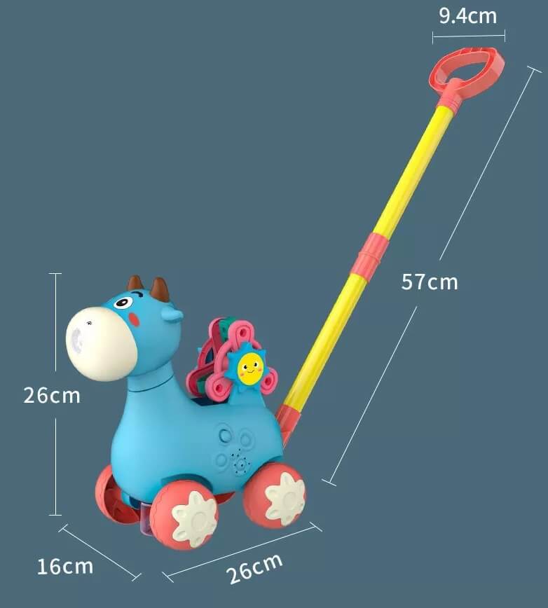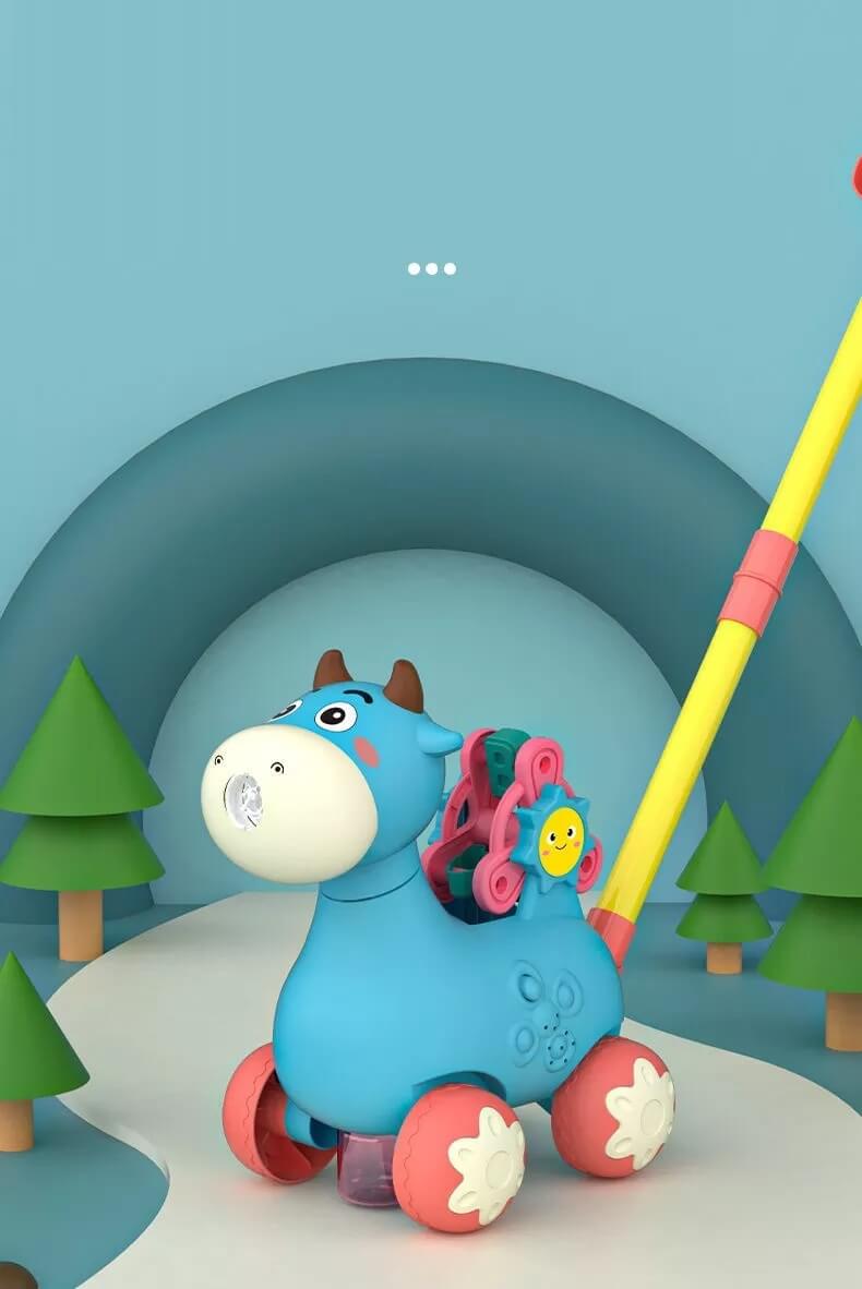 Padėkite mažyliui drąsiai žengti pirmuosius žingsnius su linksmąja karvyte Blue Fudge. Šis stumdomas žaislas motyvuoja judėti, lavina koordinaciją ir motoriką, o žaidimą paverčia švente – iš karvytės burnos leidžiasi muilo burbulai, skamba linksmos melodijos, o besisukantis ratas su raidėmis A, B, C padeda žaismingai pažinti abėcėlę.
