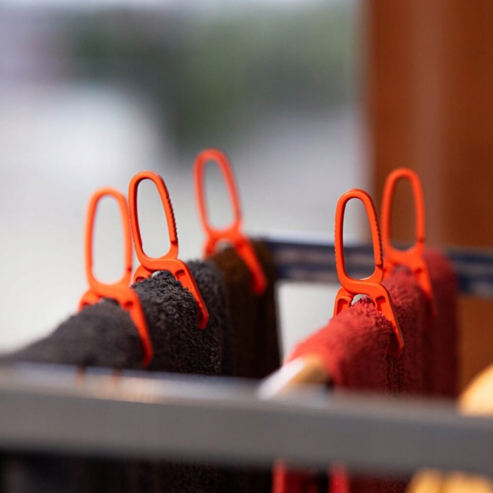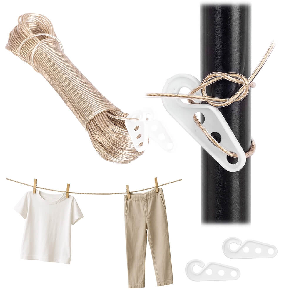 Virvė pagaminta iš atsparios medžiagos, todėl puikiai tinka tiek vidaus, tiek lauko naudojimui. Segtukai lengvai tvirtinasi prie virvės ir patikimai laiko skalbinius – jie nekris net esant vėjui. Dėžutė užtikrina, kad viskas būtų tvarkingai sudėta ir visada po ranka.