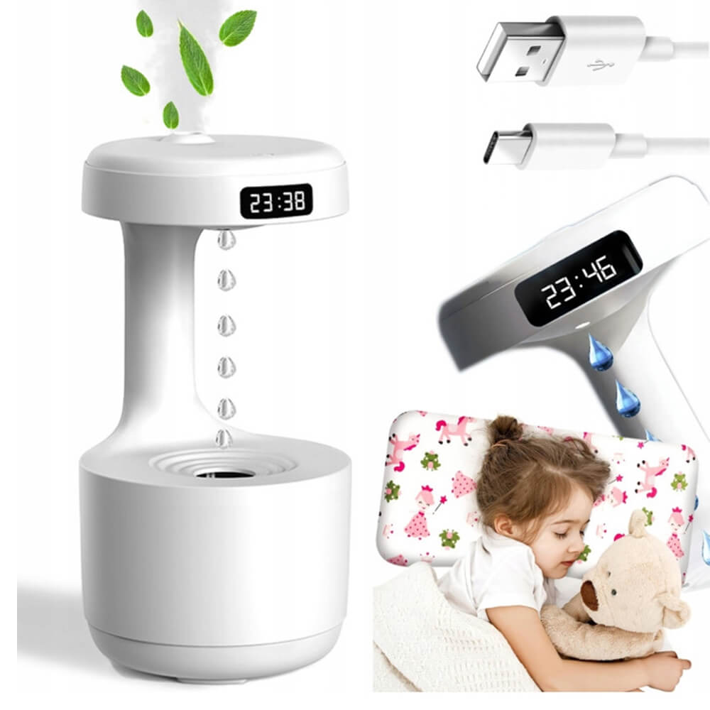 Modernus ir stilingas antigravitacinis oro drėkintuvas ne tik palaiko tinkamą drėgmės lygį patalpose, bet ir tampa tikru interjero akcentu. Vandens lašų kilimo efektas sukuria antigravitacijos iliuziją, kuri suteikia ramybės ir estetikos jūsų namams ar biurui. Integruotas LED ekranas su laikrodžiu leidžia patogiai stebėti laiką.