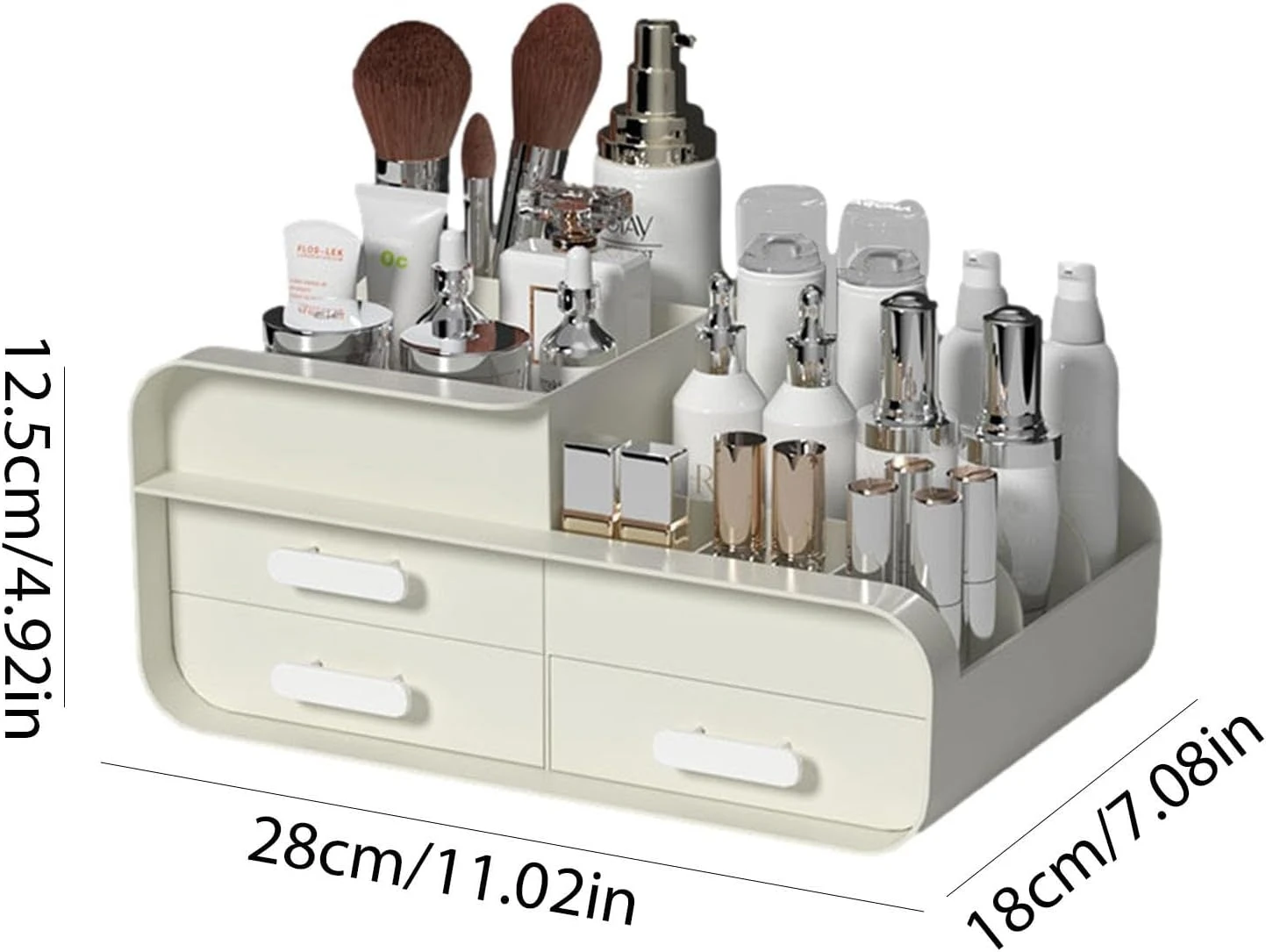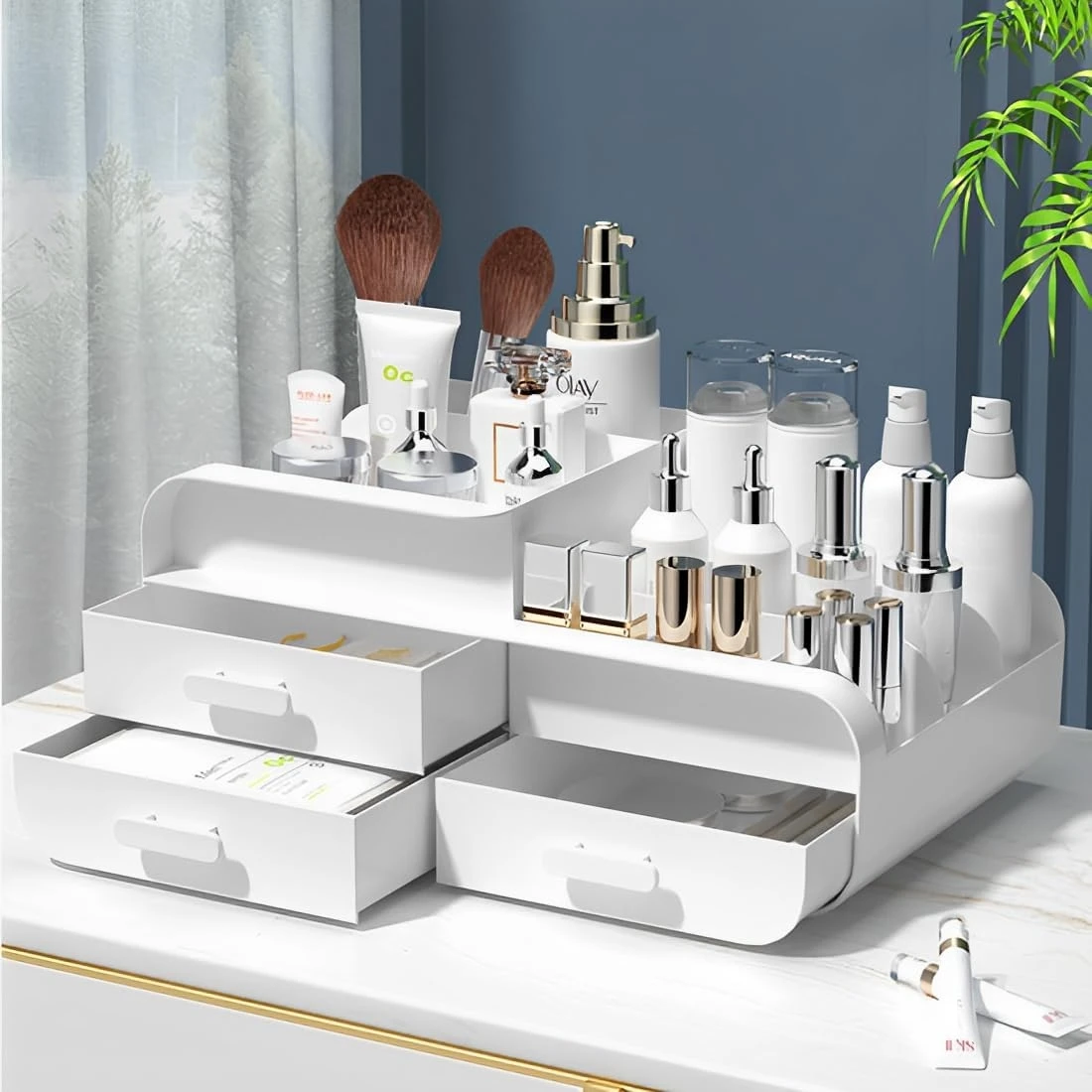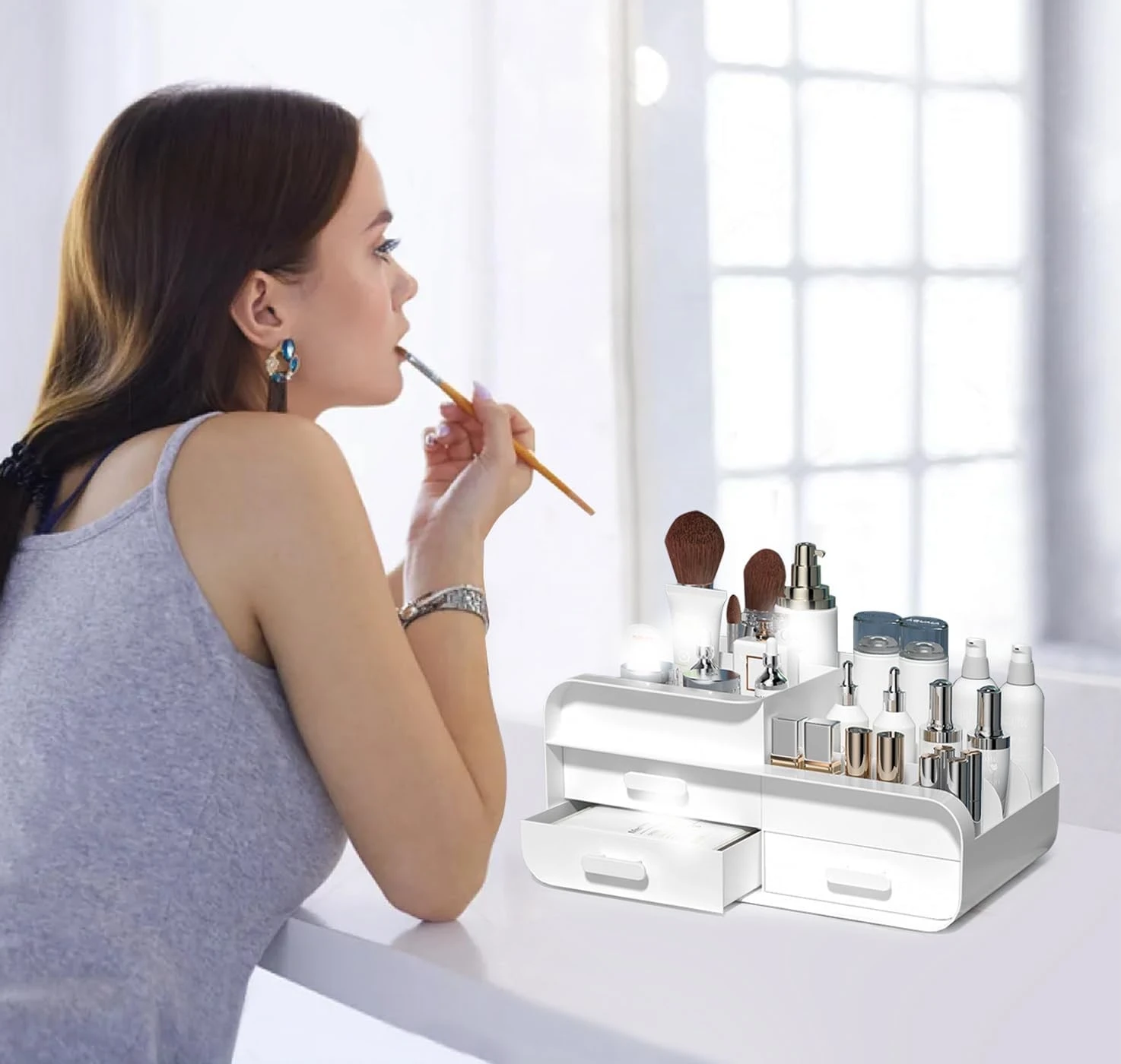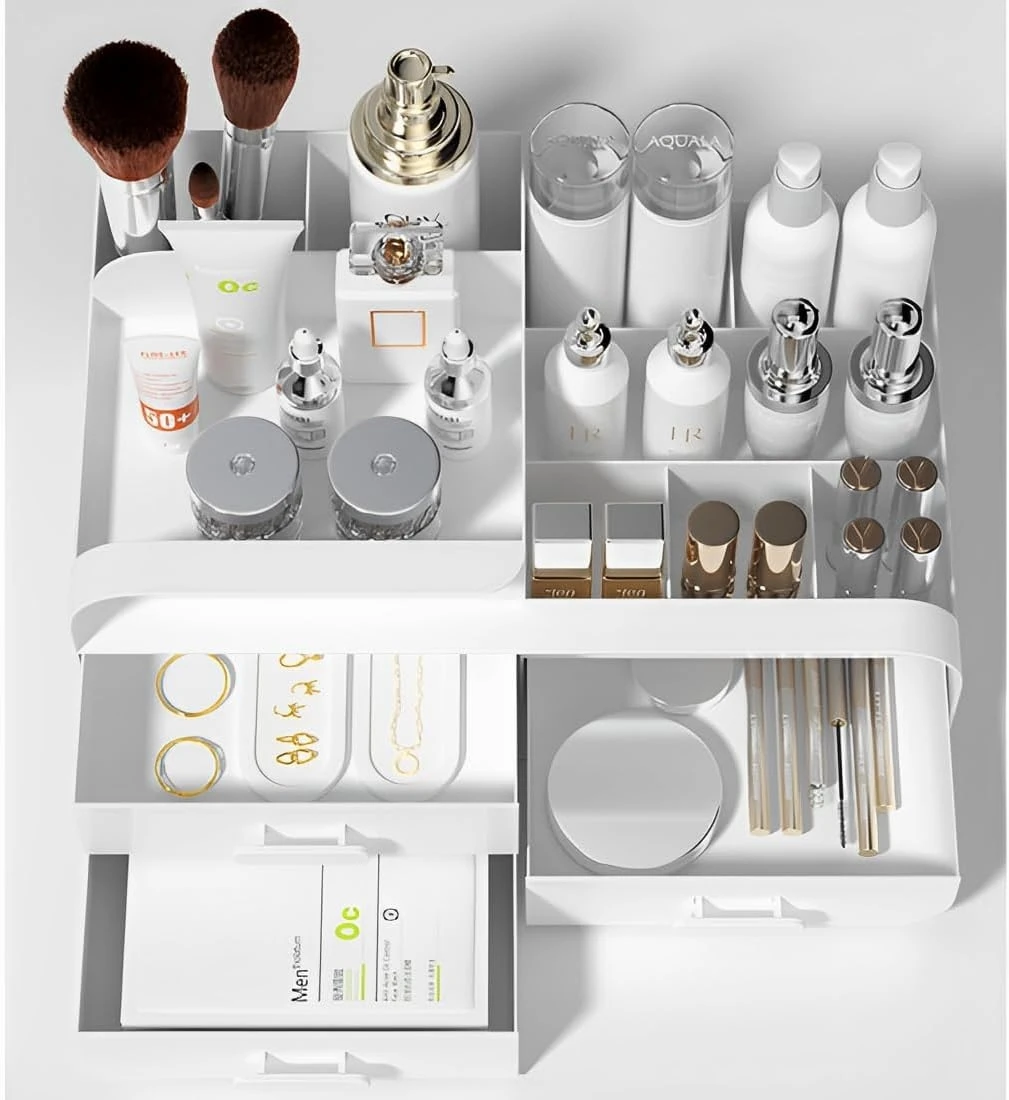 Sutvarkykite savo kosmetiką, papuošalus ir odos priežiūros priemones su šiuo stilingu ir funkcionaliu organizatoriumi. Daug vietos suteikiantis dizainas leis patogiai laikyti tiek aukštus buteliukus, tiek smulkius aksesuarus, o stalčiai padės paslėpti tai, ką norite laikyti neakivaizdžiai.