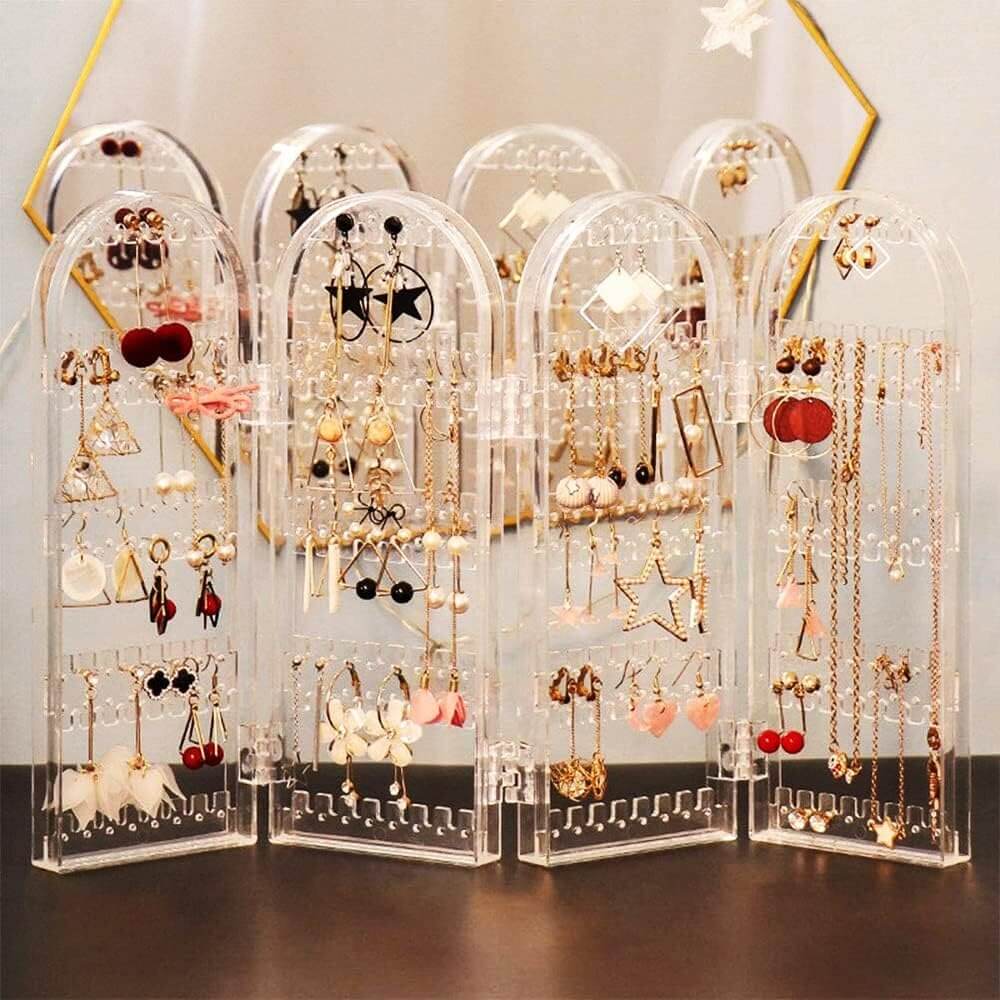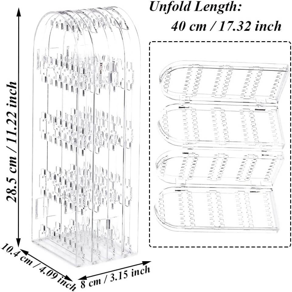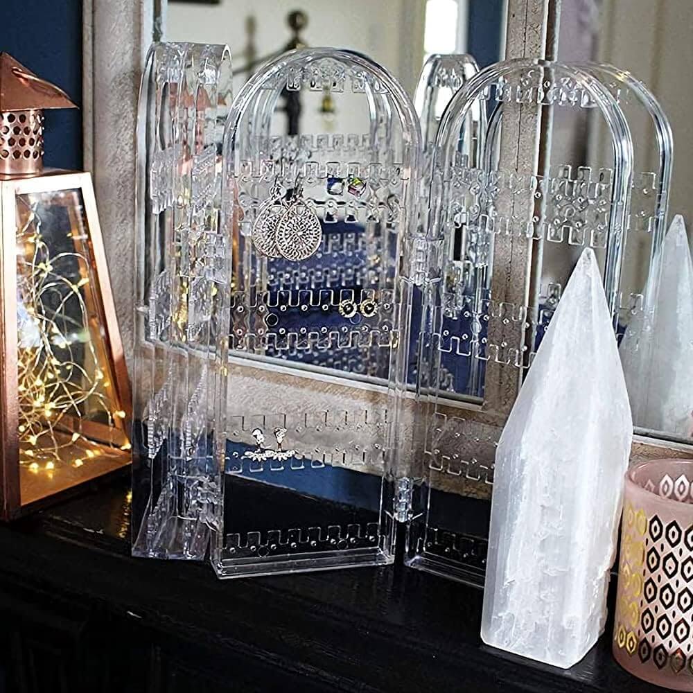 Ieškote stilingo ir praktiško būdo laikyti savo auskarus bei kitus papuošalus? Šis skaidrus plastikinis stovas – puikus pasirinkimas tiek namams, tiek kelionėms. Keturi lankstomi skydeliai leidžia patogiai išdėlioti net keliasdešimt auskarų porų ar grandinėlių, o sulankstytas stovas neužims daug vietos.