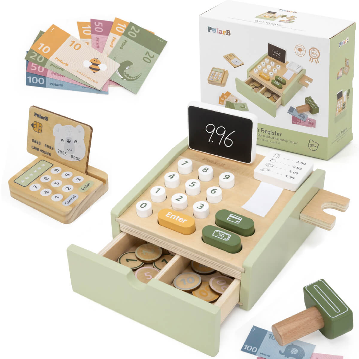 Leiskite vaikui pasijusti tikru parduotuvės darbuotoju! Šis medinis kasos aparatas įkvepia vaidmenų žaidimus, skatina socialinę sąveiką ir natūraliai moko skaičiuoti. Grynieji ar kortelė? Vaikas apskaičiuos mokėtiną sumą, priims apmokėjimą ir atiduos teisingą grąžą – smagus žaidimas virsta praktine matematika.