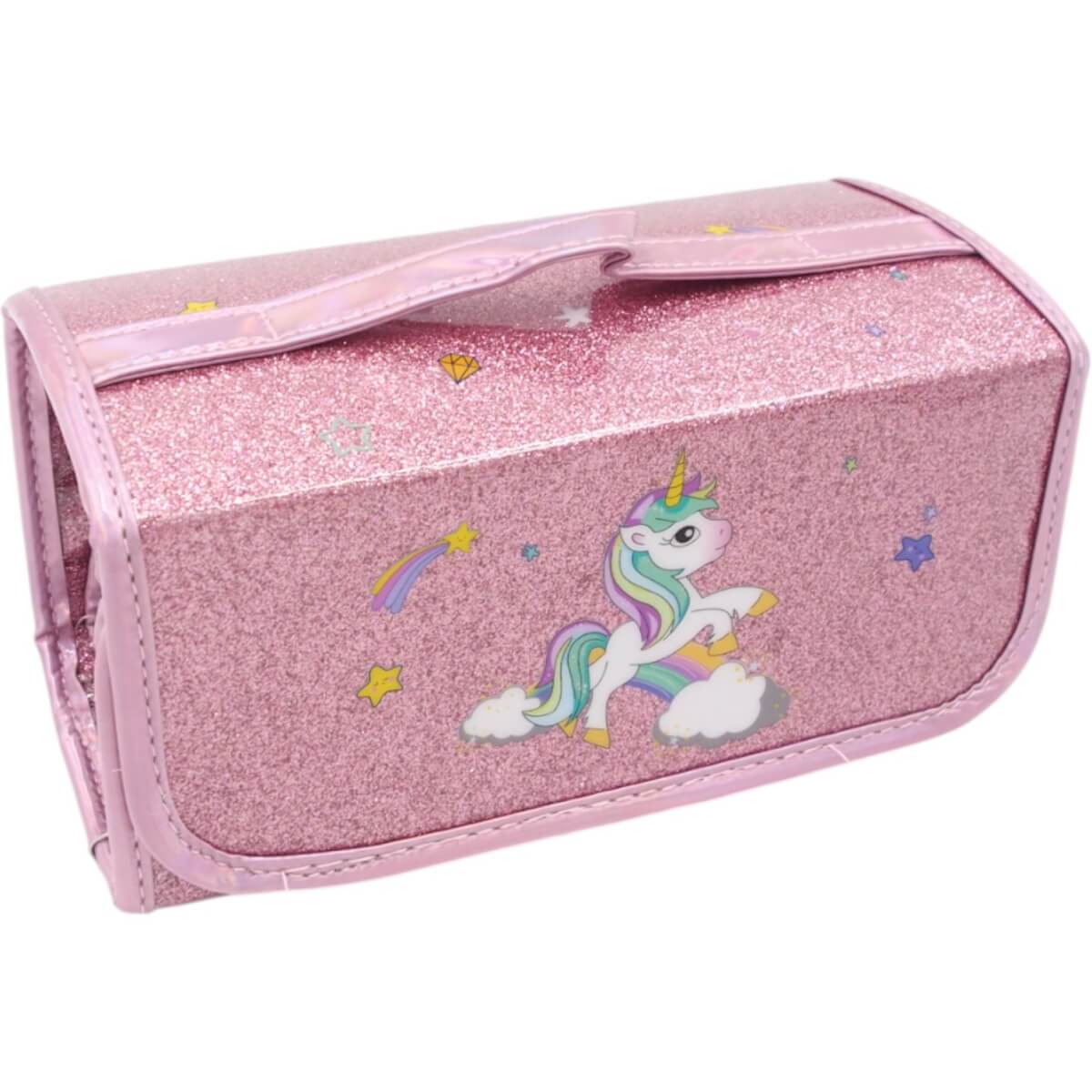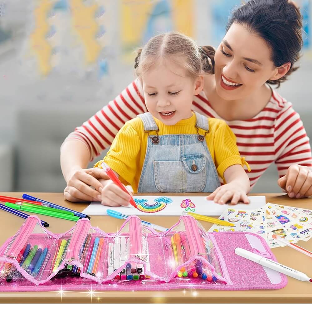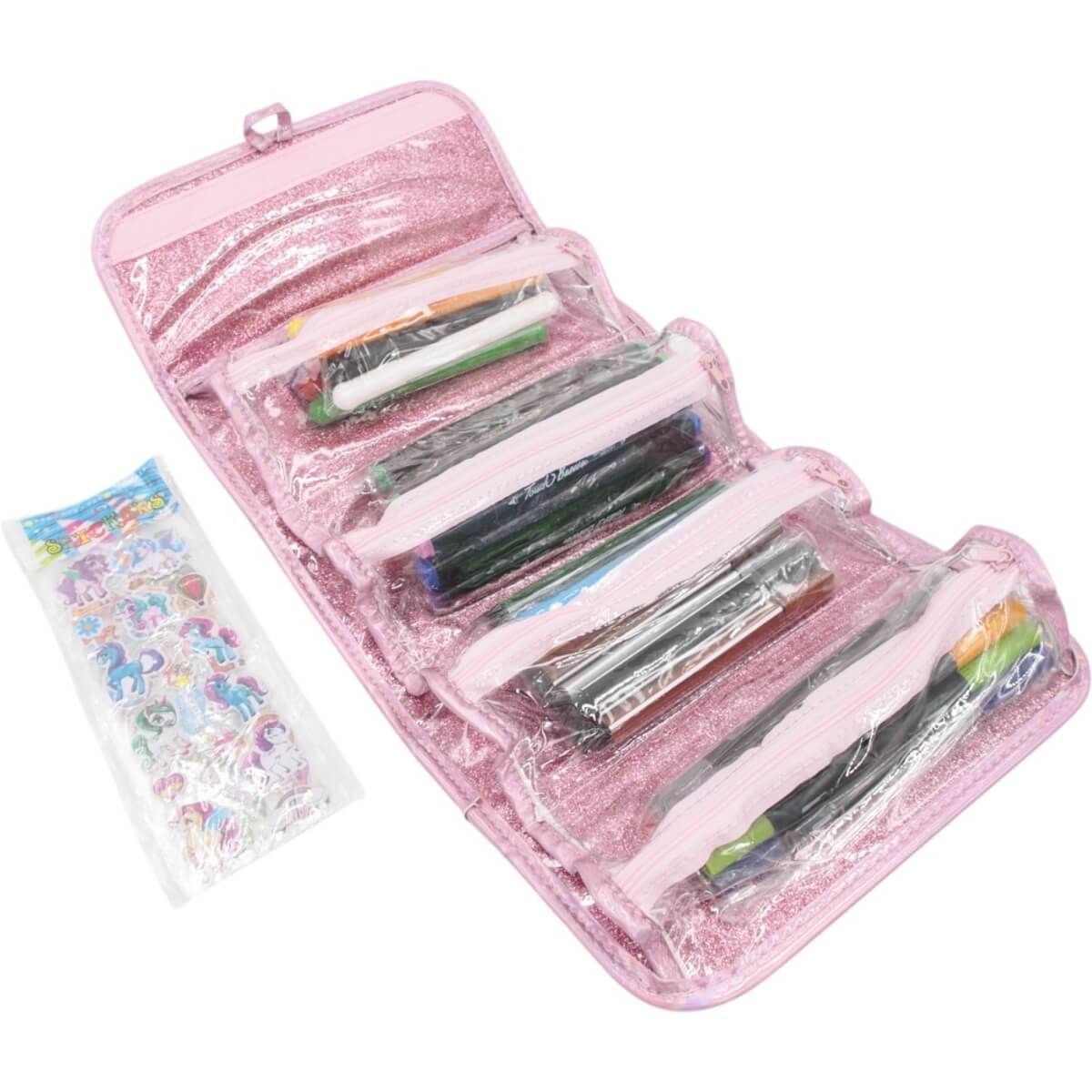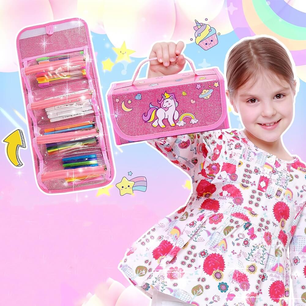 Šis žavingas piešimo rinkinys – tikra svajonė kiekvienam mažajam menininkui! Įspūdinga rožinė dėžutė su blizgučiais ir mielu vienaragiu ne tik traukia akį, bet ir yra itin praktiška – patogi rankenėlė, tvirtas užsegimas bei erdvus vidus su skaidriomis kišenėlėmis padeda palaikyti tvarką ir leidžia patogiai nešiotis visus reikalingus reikmenis bet kur.