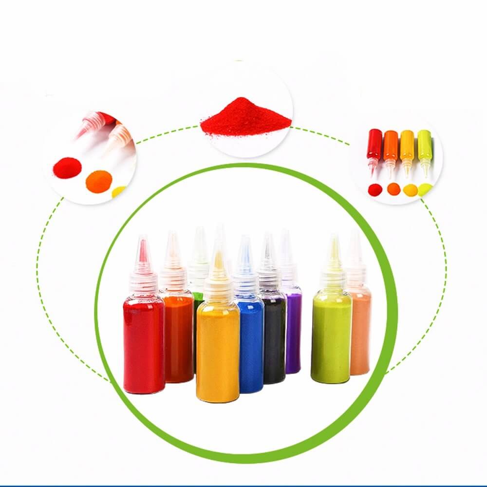 Ryškios spalvos: rinkinį sudaro net 12 buteliukų su skirtingų spalvų dekoratyviniu smėliu.
