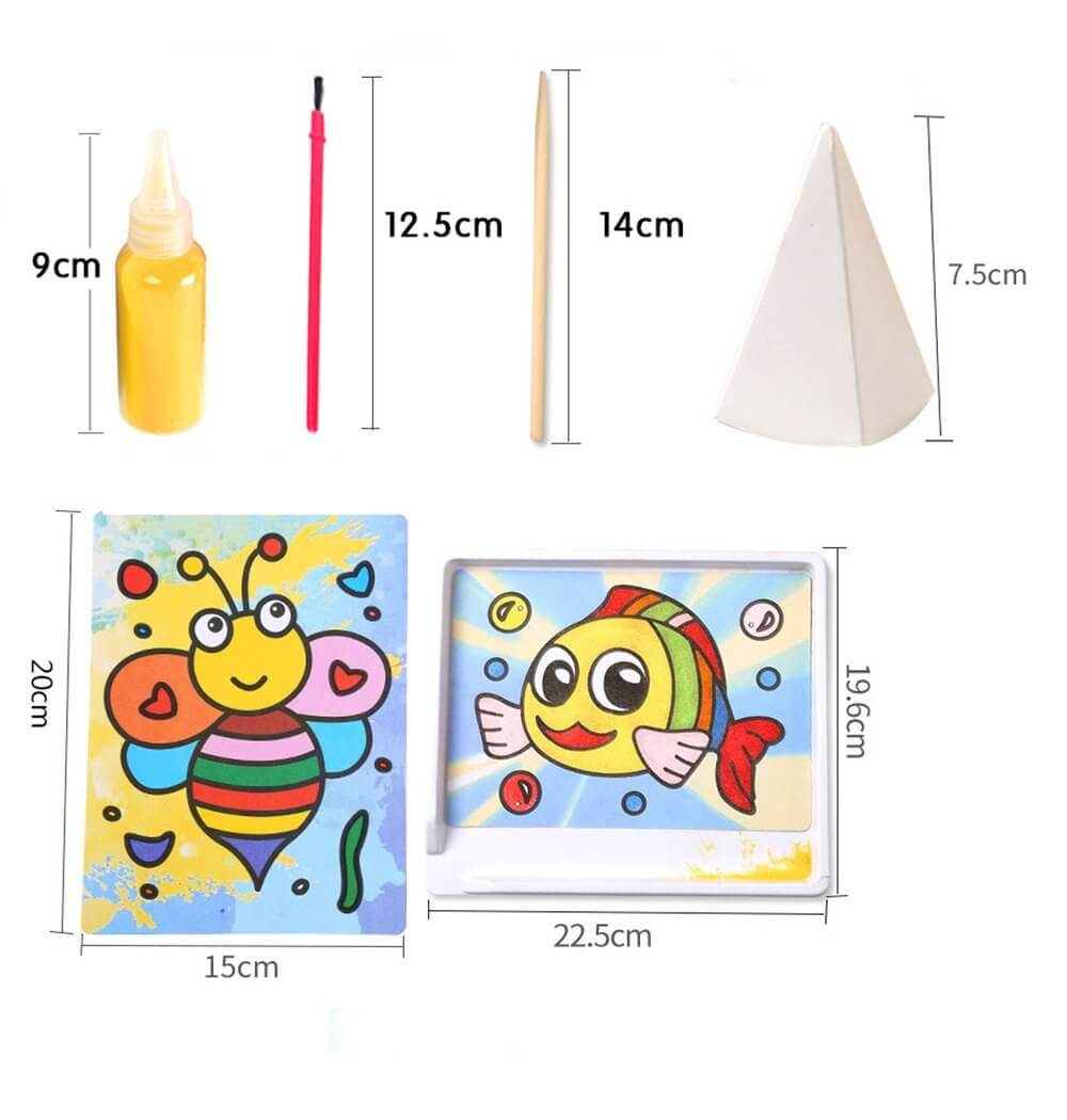 Šis spalvinimo smėliu rinkinys taps mėgstama vaikų pramoga ir puoš jų kambario sienas originaliais darbais!