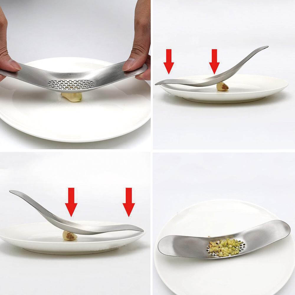 - Priemonę labai paprasta naudoti (tereikia paspausti česnaką ir sukamaisiais judesiais sutrinti).