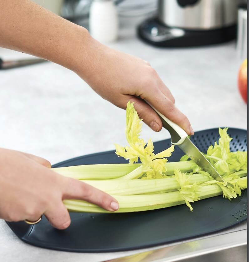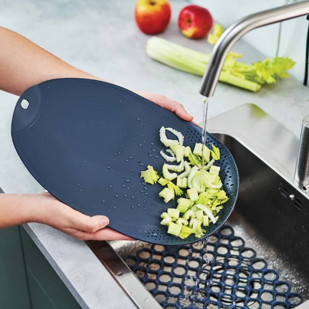 - Paruoštas daržoves ar vaisius ant lentos galite lemgvai plauti, nusausinti ir supjaustyti nenaudodami kitų indų. Kiaurasamčio dėka taip pat galime naudoti supjaustytų vaisių ir daržovių sultis.