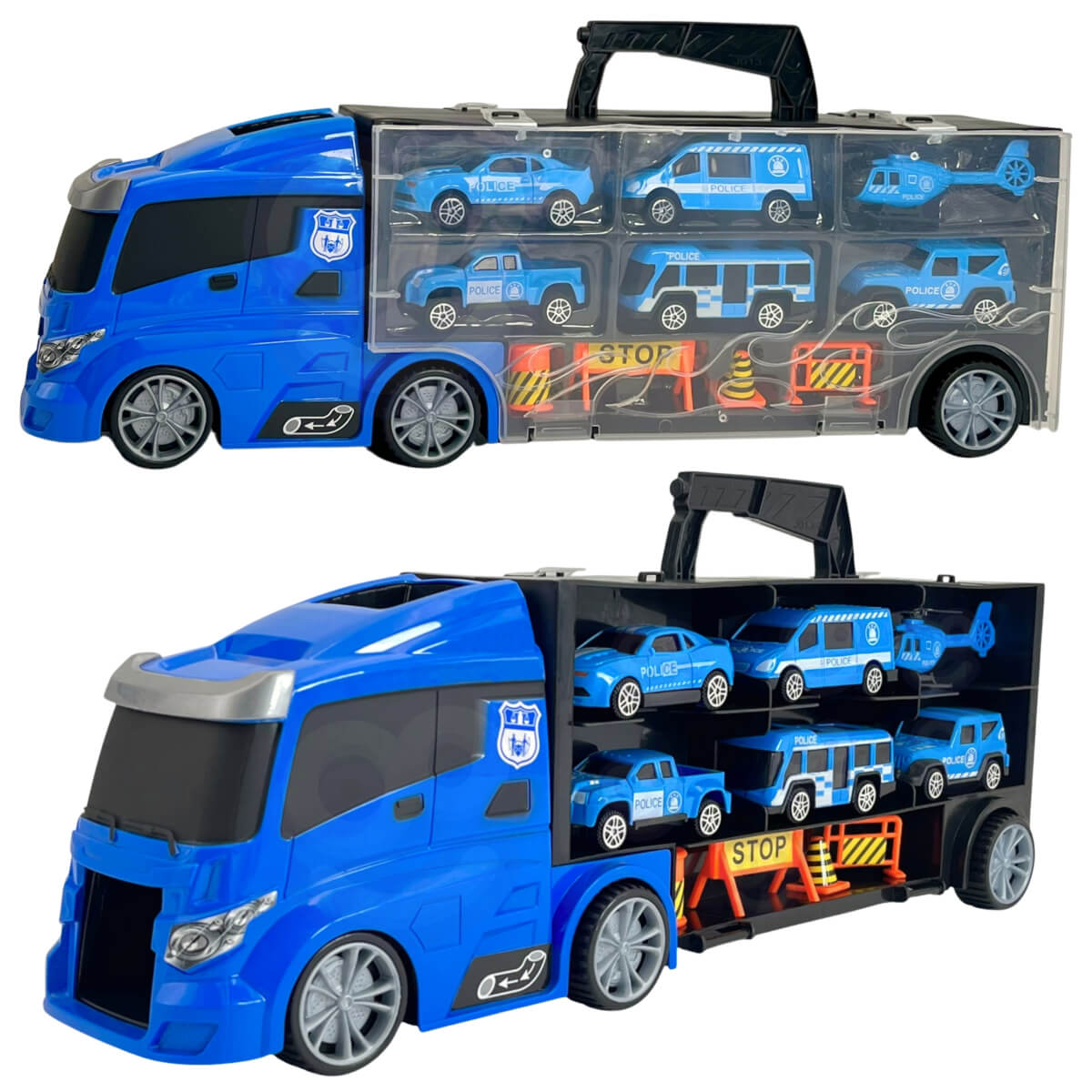 Didelis, veiksmo kupinas ir edukacinis rinkinys mažiesiems policijos technikos ir transporto gerbėjams. Įspūdingo dydžio TIR priekaba (iki 40 cm) talpina iki 4 automobilių, o integruotas paleidimo įtaisas leidžia juos šauti skirtingais atstumais – dar daugiau dinamikos ir nuotykių kiekviename žaidime. Į komplektą įtraukti įspėjamieji ženklai ir kliūtys padeda žaismingai mokytis saugaus eismo pagrindų, lavina vaizduotę ir skatina kurti savus policijos scenarijus.
