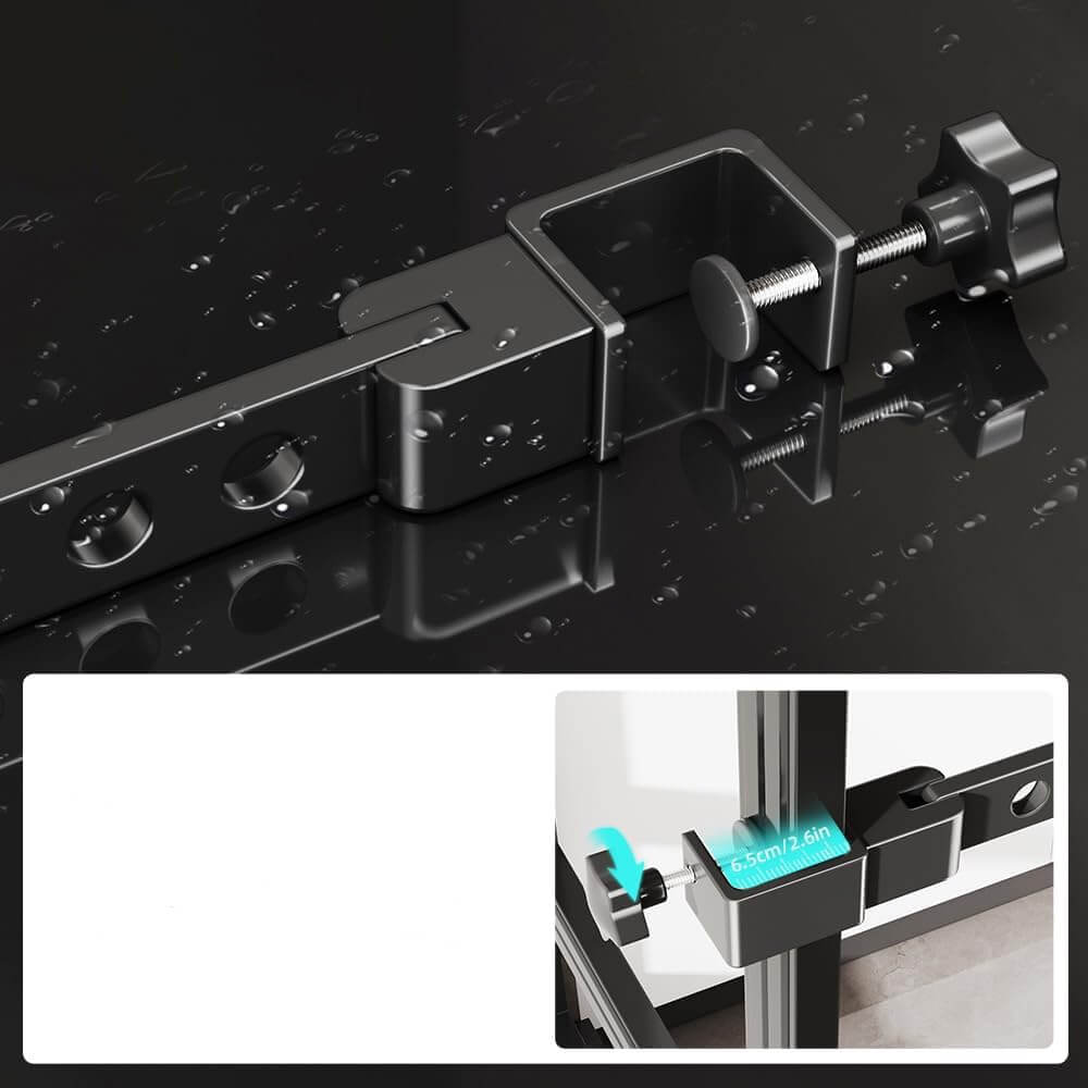 Tvirtinimas be gręžimo: Paprastas prisukamas mechanizmas leidžia tvirtai ir saugiai pritvirtinti prie įvairių paviršių (iki 6,5 cm storio).