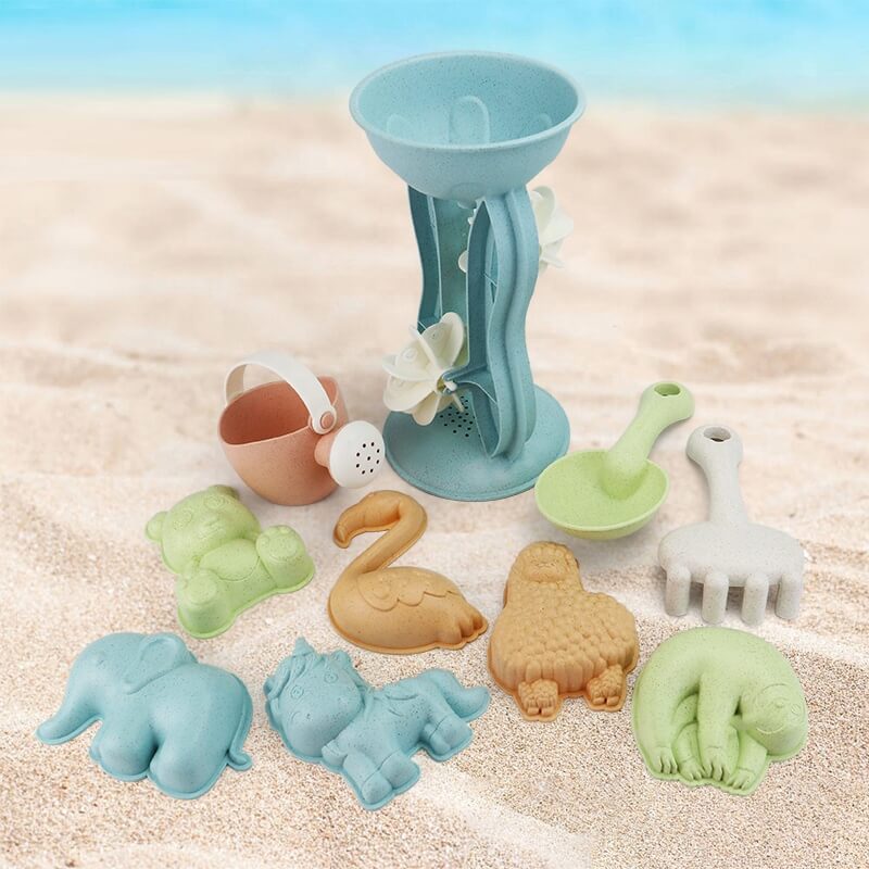 - Pilnas 10 dalių komplektas: viskas, ko reikia kūrybiškam žaidimui smėlyje.