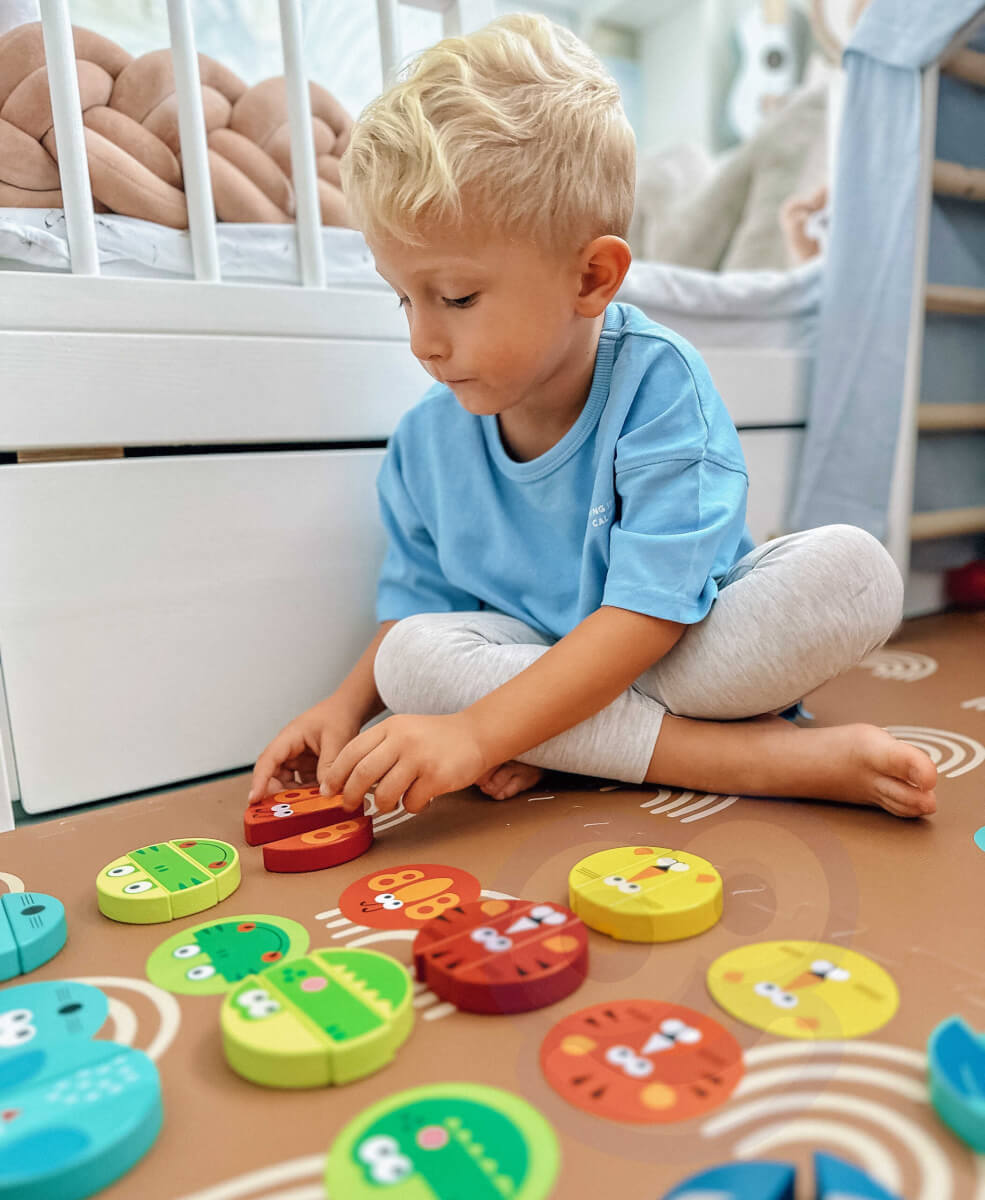 - 45 medines kaladėles su 15 skirtingų gyvūnų atvaizdais.