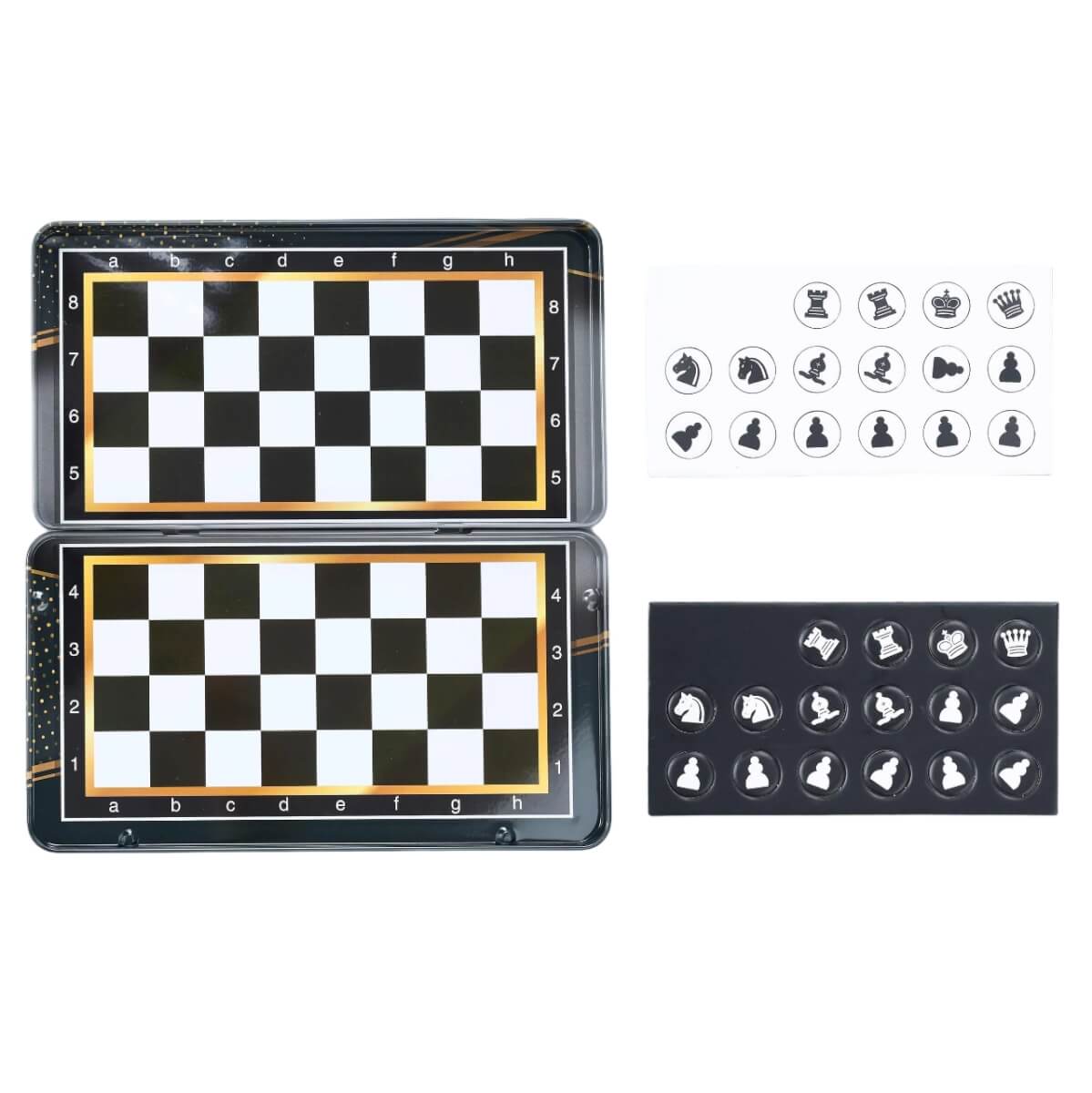 - Metalinė dėžutė = lenta – dėžutė atsidarius tampa žaidimo lenta, o užsidarius saugiai laiko visas detales.