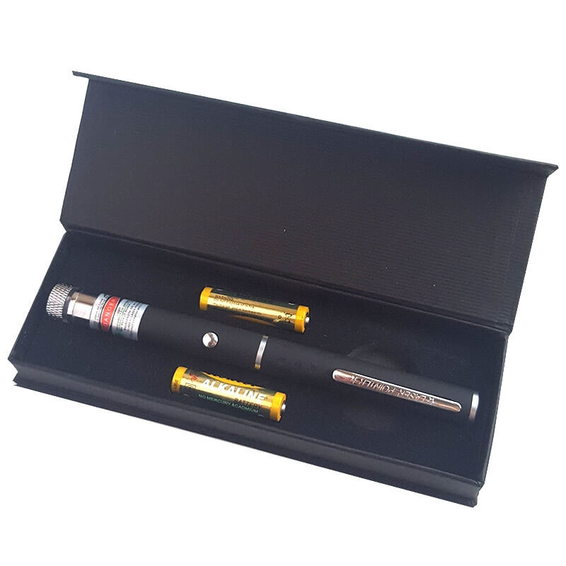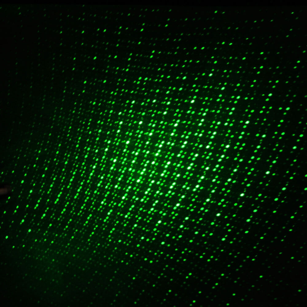 Žalio lazerio komplekte pridedama viena efektų galvutė (daug taškų) ir dvi AA baterijos