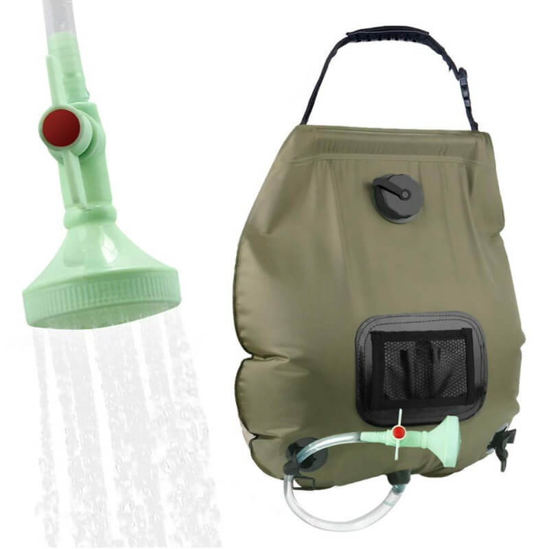 Nešiojamas saulės dušas, puikiai tinkantis kelionėms palapinėje ir kempinguose.
