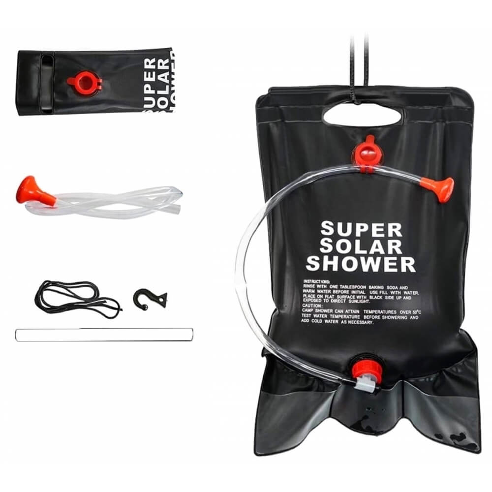 Dušas yra kompaktiškas, lengvas ir neužima daug vietos, todėl lengvai telpa į kuprinę ar kelioninį krepšį. Vanduo šildomas saulės energija – palikus saulėje kelioms valandoms, temperatūra gali pakilti iki ~48 °C (priklauso nuo oro sąlygų). Pripildymas paprastas: tereikia atsukti kamštelį. Komplekte esanti žarnelė su kraneliu ir dušo galvute leidžia patogiai reguliuoti vandens srautą ir naudotis bet kur.