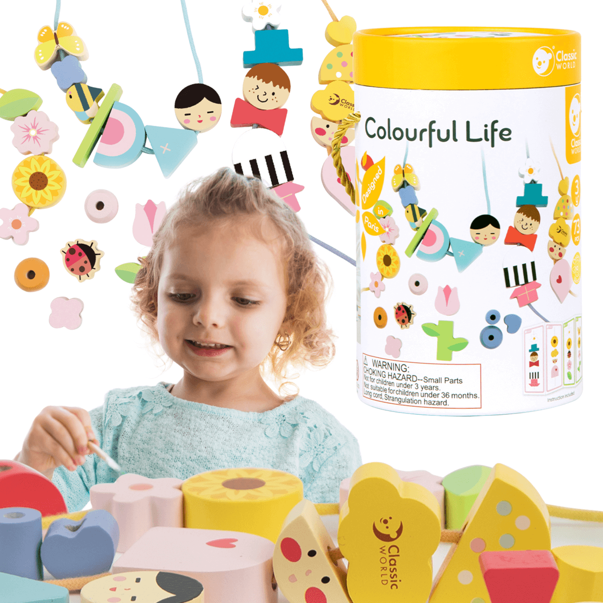 Šis spalvingas veriamas žaislas skatina pirštukų miklumą, akių–rankos koordinaciją ir kūrybišką mąstymą. Vaikai veria karoliukus ir formas ant raištelių, derina figūrėlių elementus (pvz., parenka berniuko ar mergaitės galvai tinkamus drabužėlius, gėlei – žiedą ir kotelį), o kortelės su pavyzdžiais padeda atkurti reikiamas figūras arba kurti savas kompozicijas.
