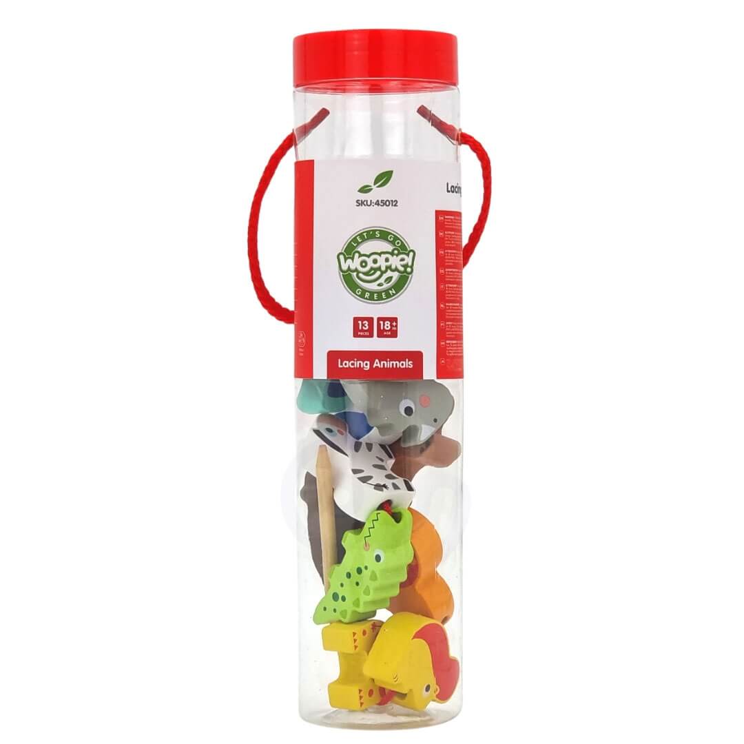 Medinės vėrimo kaladėlės Animals Safari ZOO (WOOPIE, GREEN serija) – žaismingas ir ekologiškas būdas lavinti mažylio įgūdžius nuo 18 mėn. Tai klasikinis vėrimo žaidimas: vaikas veria virvelę per medines kaladėles su skylutėmis, kurdamas savo safario istorijas, sekas ir raštus. Smagi veikla ramina, skatina susikaupimą ir žadina smalsumą laukinių gyvūnų pasauliui.