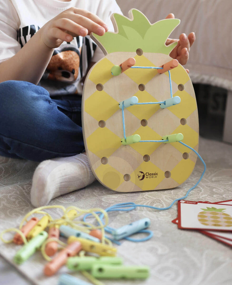 Classic World Pineapple Pegs – žaismingas ir estetiškas vėrimo žaidimas, suteiksiantis vaikui valandų valandas prasmingos pramogos.